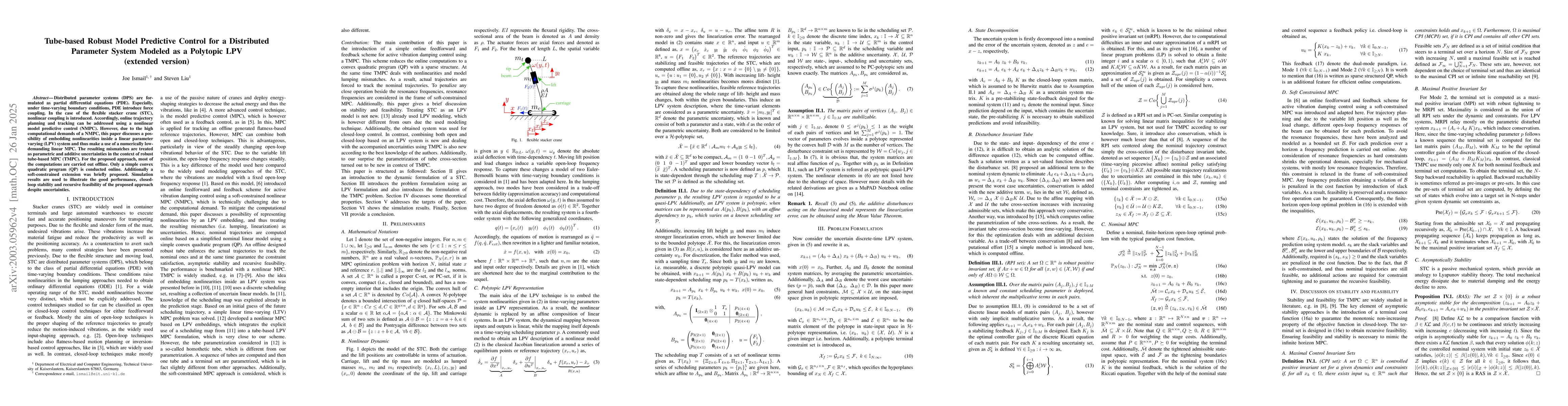 The research proposes a tube-based model predictive control (TMPC) scheme for active vibration damping control of stacker cranes (STC), formulated as a linear parameter-varying (LPV) system. It uses offline computation of most elements and an online simple convex quadratic program (QP) for real-time implementation.