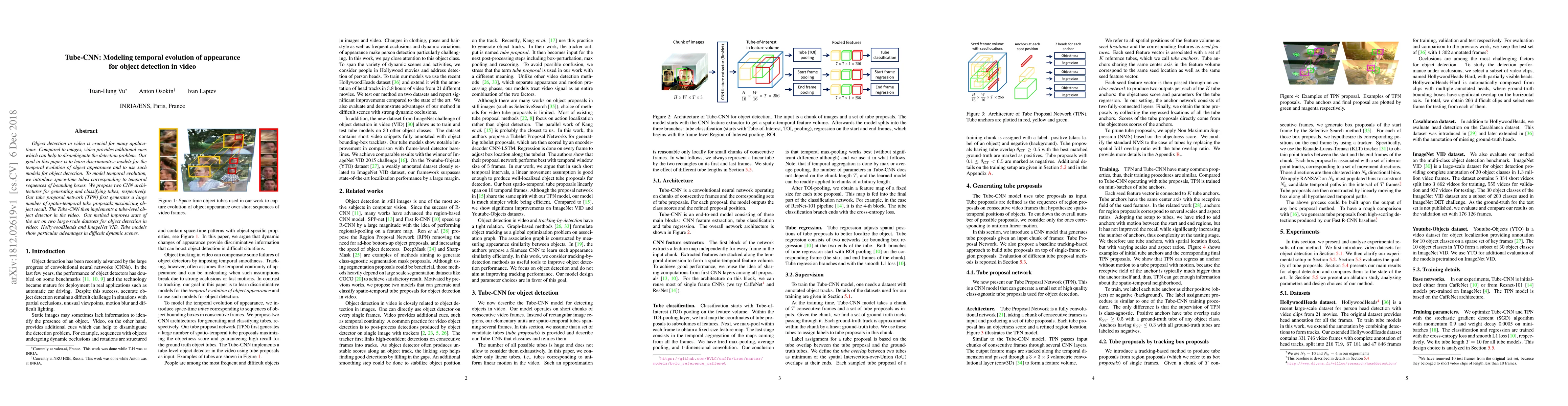This paper proposes Tube-CNN, a method for object detection in video by modeling temporal evolution of object appearance using space-time tubes. It employs two CNN architectures: a tube proposal network (TPN) for generating spatio-temporal tube proposals and a Tube-CNN for classifying them, achieving state-of-the-art results on HollywoodHeads and ImageNet VID datasets.