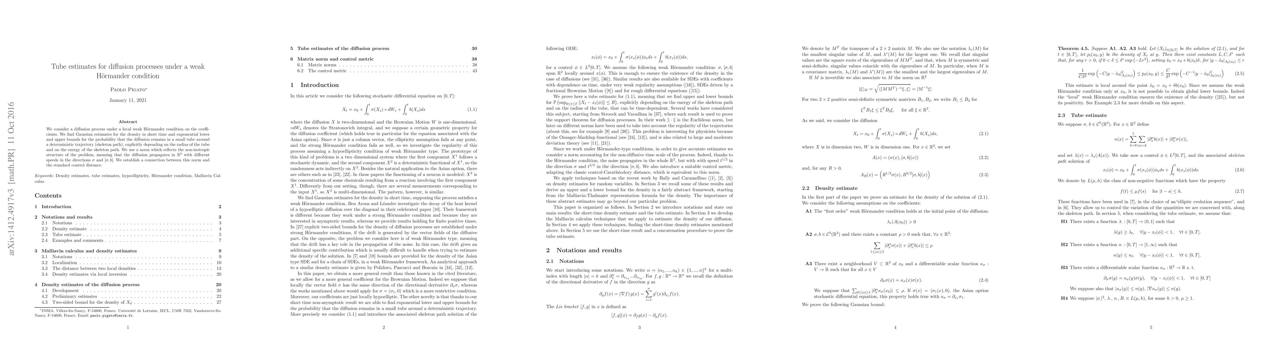 We consider a diffusion process under a local weak H\"{o}rmander condition on the coefficients. We find Gaussian estimates for the density in short time and exponential lower and upper bounds for the probability that the diffusion remains in a small tube around a deterministic trajectory (skeleton path), explicitly depending on the radius of the tube and on the energy of the skeleton path. We use a norm which reflects the non-isotropic structure of the problem, meaning that the diffusion propagates in $\mathbb{R}^2$ with different speeds in the directions $\sigma$ and $[\sigma,b]$. We establish a connection between this norm and the standard control distance.