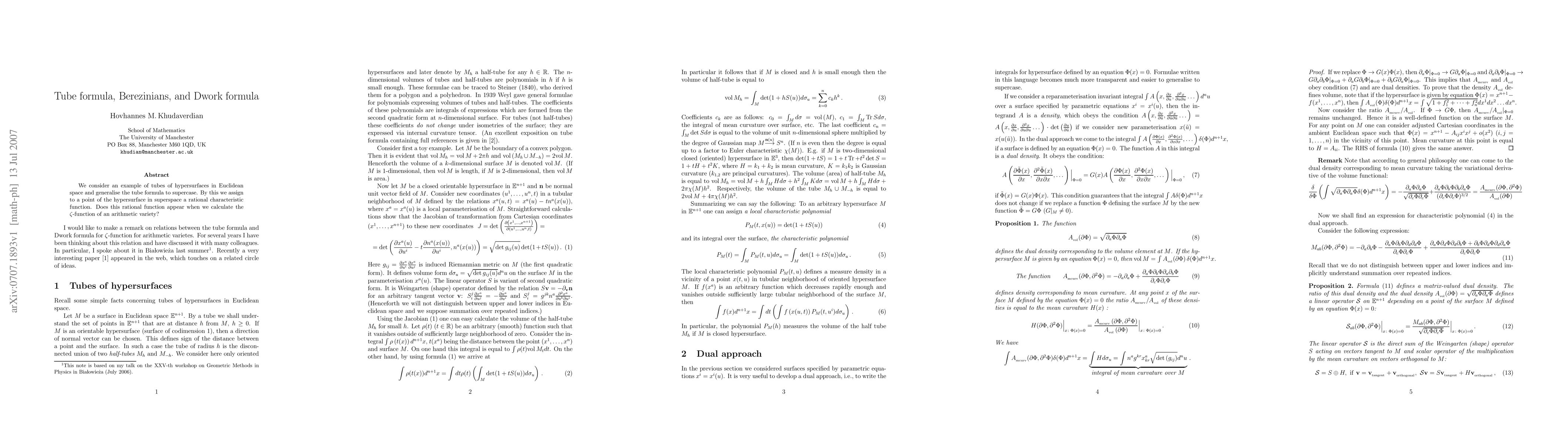 We consider an example of tubes of hypersurfaces in Euclidean space and generalise the tube formula to supercase. By this we assign to a point of the hypersurface in superspace a rational characteristic function. Does this rational function appear when we calculate the zeta-function of an arithmetic variety?
