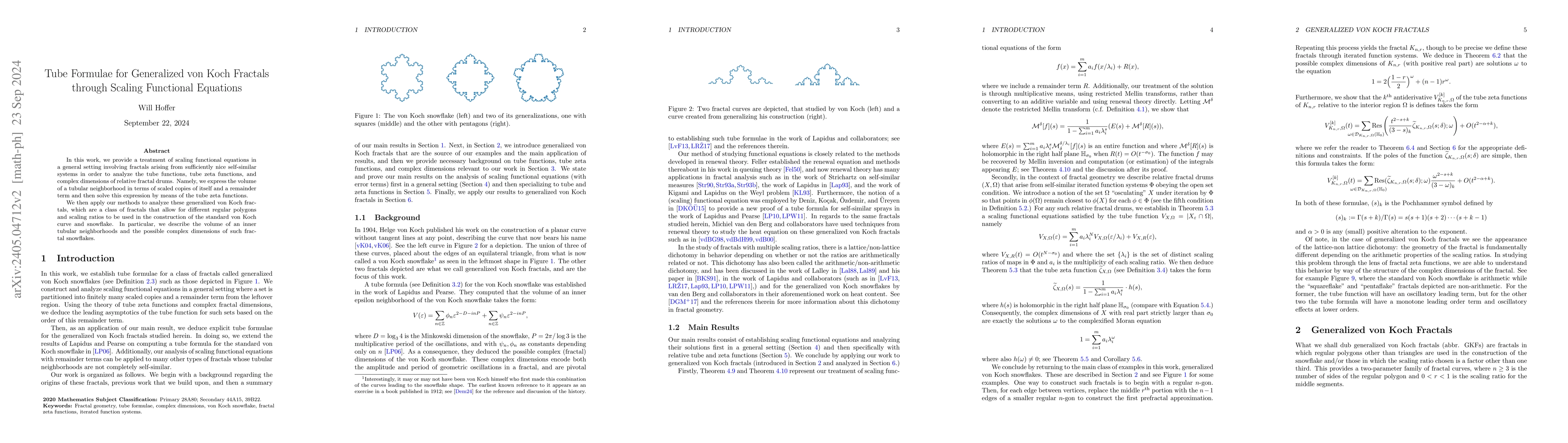 This research investigates scaling functional equations to derive tube formulae for generalized von Koch fractals, expressing the volume of tubular neighborhoods in terms of scaled copies and solving via tube zeta functions. It analyzes the complex dimensions and volume of inner tubular neighborhoods for these fractals, which use varied polygons and scaling ratios.