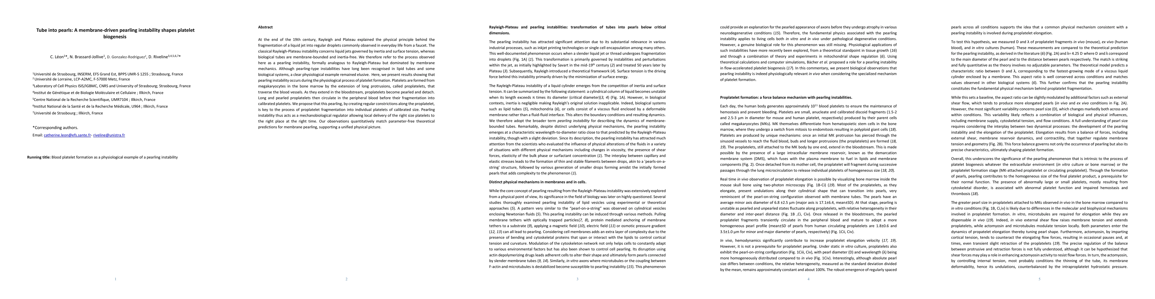 At the end of the 19th century, Rayleigh and Plateau explained the physical principle behind the fragmentation of a liquid jet into regular droplets commonly observed in everyday life from a faucet. The classical Rayleigh-Plateau instability concerns liquid jets governed by inertia and surface tension, whereas biological tubes are membrane-bounded and inertia-free. We therefore refer to the process observed here as a pearling instability, formally analogous to Rayleigh-Plateau but dominated by membrane mechanics. Although pearling-type instabilities have long been recognised in lipid tubes and some biological systems, a clear physiological example remained elusive. Here, we present results showing that pearling instability occurs during the physiological process of platelet formation. Platelets are formed from megakaryocytes in the bone marrow by the extension of long protrusions, called proplatelets, that traverse the blood vessels. As they extend in the bloodstream, proplatelets become pearled and detach. Long and pearled proplatelets then circulate in the peripheral blood before their fragmentation into calibrated platelets. We propose that this pearling, by creating regular constrictions along the proplatelet, is key to the process of proplatelet fragmentation into individual platelets of calibrated size. Pearling instability thus acts as a mechanobiological regulator allowing local delivery of the right size platelets to the right place at the right time. Our observations quantitatively match parameter-free theoretical predictions for membrane pearling, supporting a unified physical picture.