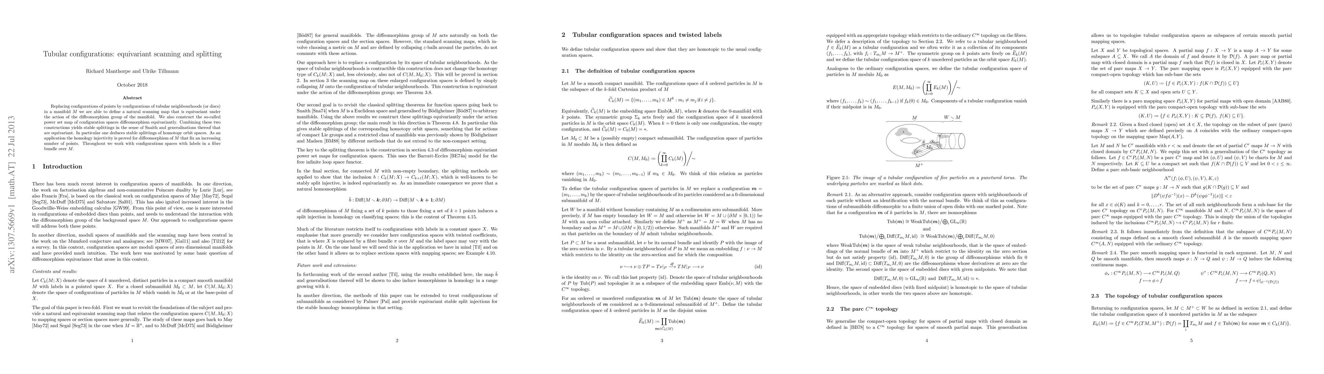 Replacing configurations of points by configurations of tubular neighbourhoods (or discs) in a manifold, we are able to define a natural scanning map that is equivariant under the action of the diffeomorphism group of the manifold. We also construct the so-called power set map of configuration spaces diffeomorphism equivariantly. Combining these two constructions yields stable splittings in the sense of Snaith and generalisations thereof that are equivariant. In particular one deduces stable splittings of homotopy orbit spaces. As an application the homology injectivity is proved for diffeomorphism of manifolds that fix an increasing number of points. Throughout we work with configurations spaces with labels in a fibre bundle.