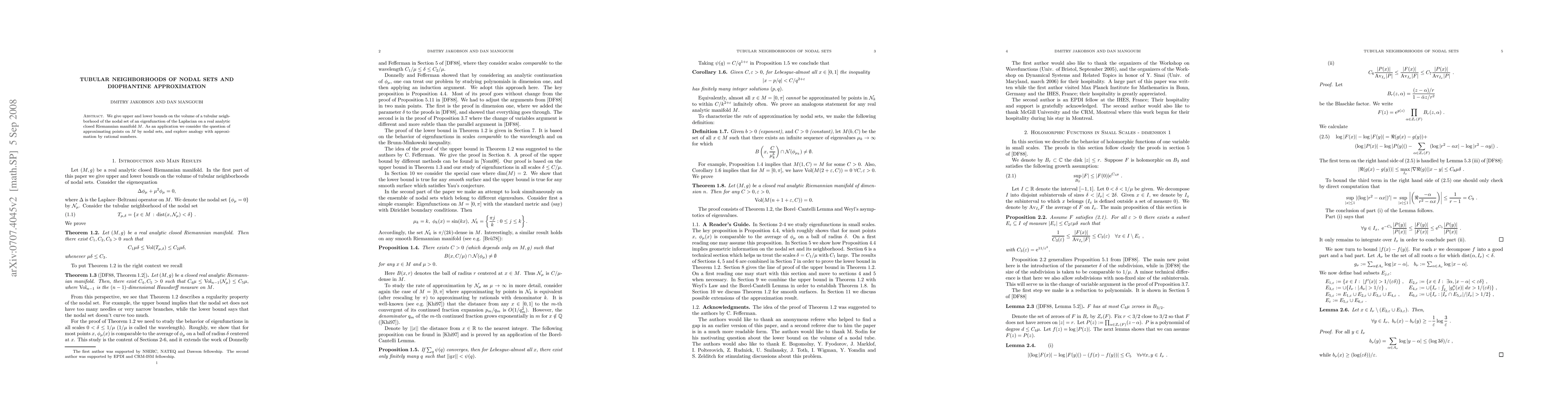 This paper provides bounds on the volume of tubular neighborhoods around the nodal sets of eigenfunctions of the Laplacian on real analytic closed Riemannian manifolds. It also examines the approximation of points on the manifold by nodal sets, drawing parallels to Diophantine approximation by rational numbers.