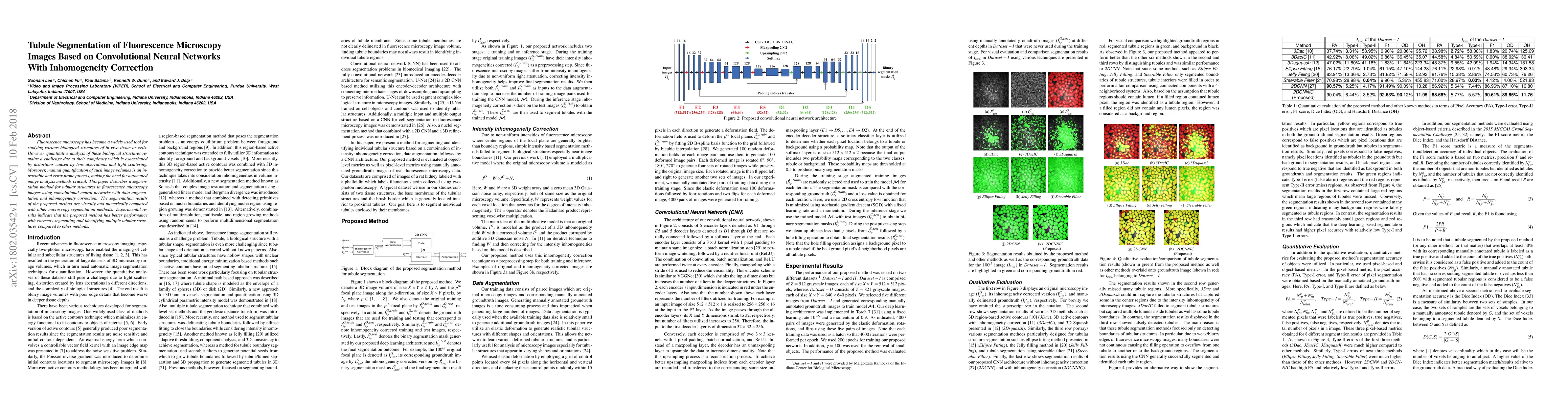 This paper proposes a convolutional neural network-based method for segmenting tubular structures in fluorescence microscopy images, incorporating data augmentation and inhomogeneity correction to address distortions. Experimental results show superior performance compared to other segmentation methods, highlighting its effectiveness in automated analysis.