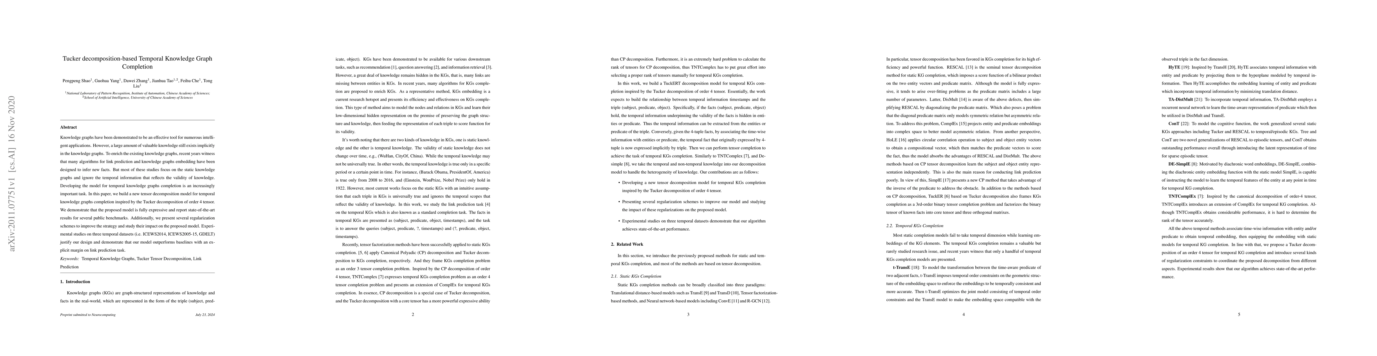 This paper proposes a Tucker decomposition-based model for temporal knowledge graph completion, demonstrating state-of-the-art performance on public benchmarks. The model incorporates temporal information to infer new facts, and regularization schemes enhance its effectiveness, as shown by superior results on three temporal datasets.