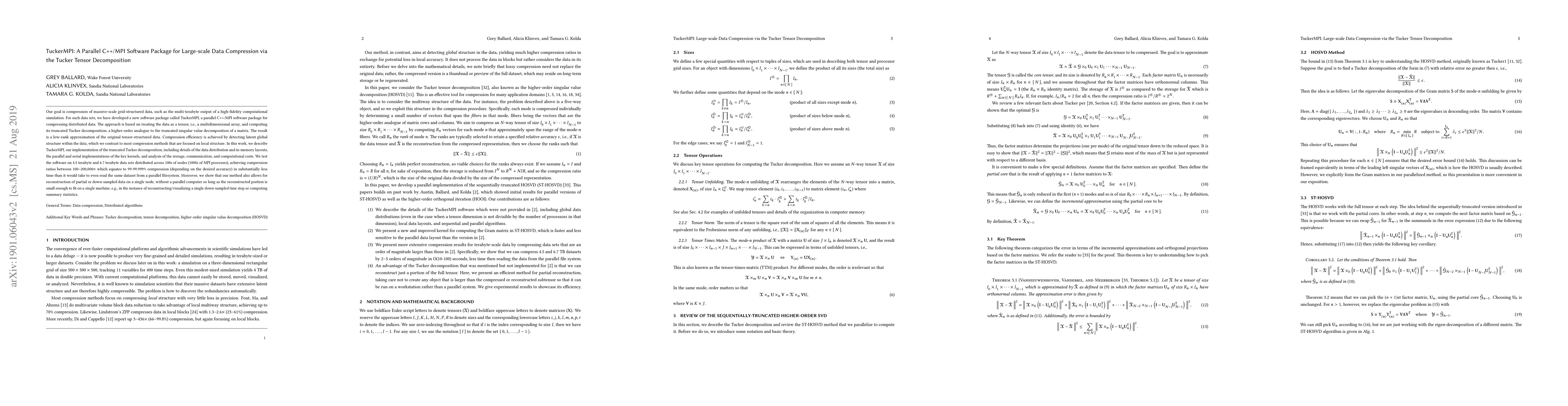Researchers developed TuckerMPI, a parallel C++/MPI software package for compressing massive-scale data using Tucker tensor decomposition, achieving 99-99.999% compression in less time than reading the dataset from a parallel filesystem.