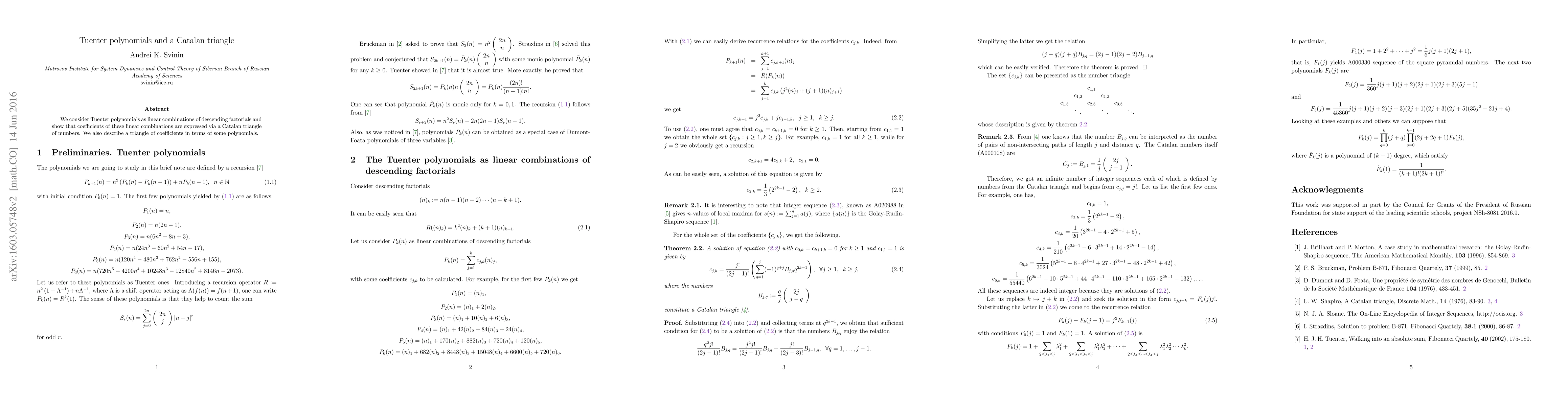 Summary: This paper explores Tuenter polynomials, which are linear combinations of descending factorials, and demonstrates that their coefficients can be represented using a Catalan triangle of numbers. Additionally, it introduces a new triangle of coefficients linked to specific polynomials.