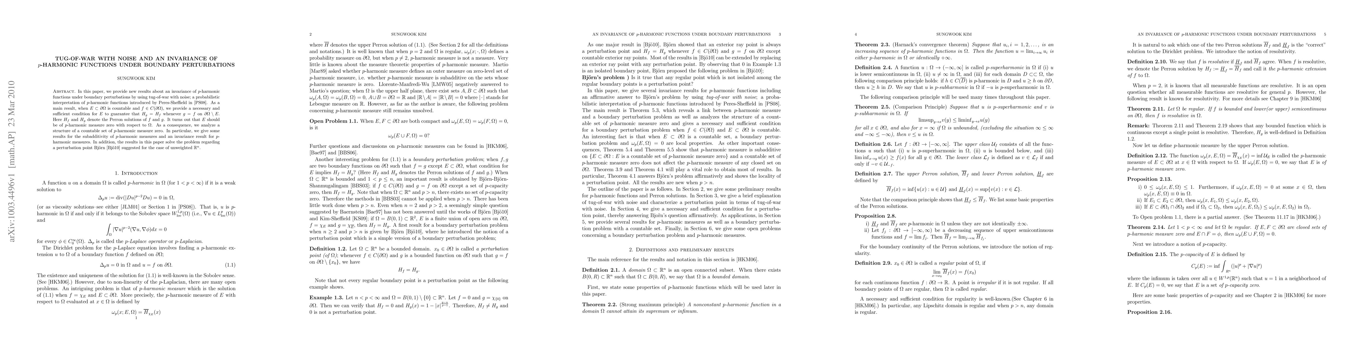 In this paper, we provide new results about an invariance of $p$-harmonic functions under boundary perturbations by using tug-of-war with noise; a probabilistic interpretation of $p$-harmonic functions introduced by Peres-Sheffield in \cite{ps}. As a main result, when $E\subset\bo $ is countable and $f\in C(\bo)$, we provide a necessary and sufficient condition for $E$ to guarantee that $H_g=H_f$ whenever $g=f$ on $\bo\setminus E$. Here $H_f$ and $H_g$ denote the Perron solutions of $f$ and $g$. It turns out that $E$ should be of $p$-harmonic measure zero with respect to $\Omega$. As a consequence, we analyze a structure of a countable set of $p$-harmonic measure zero. In particular, we give some results for the subadditivity of $p$-harmonic measures and an invariance result for $p$-harmonic measures. In addition, the results in this paper solve the problem regarding a perturbation point Bj\"orn \cite{Bjorn} suggested for the case of unweighted $\R^n$.