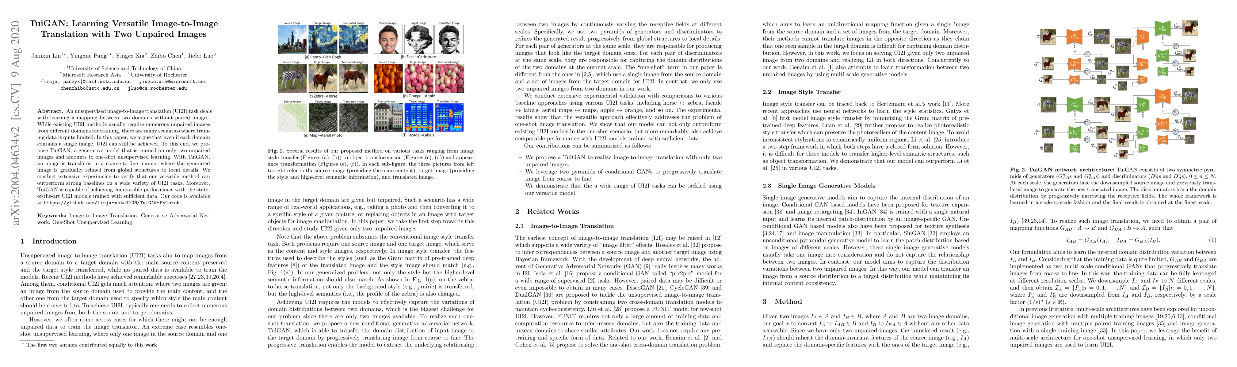 TuiGAN is a generative model for one-shot unsupervised image-to-image translation, trained on just two unpaired images, achieving versatile performance across various tasks. It refines generated images in a coarse-to-fine manner, outperforming strong baselines and rivaling models trained with abundant data.