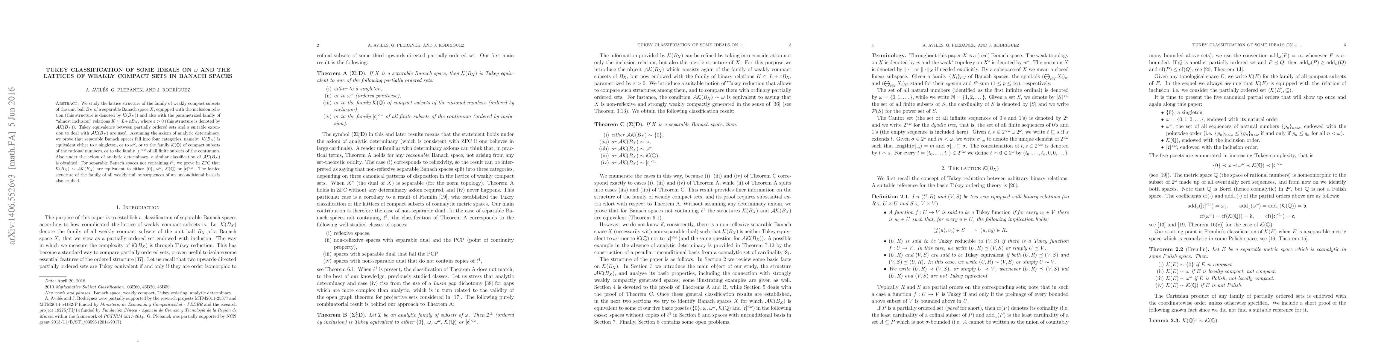 We study the lattice structure of the family of weakly compact subsets of the unit ball $B_X$ of a separable Banach space $X$, equipped with the inclusion relation (this structure is denoted by $\mathcal{K}(B_X)$) and also with the parametrized family of almost inclusion relations $K \subseteq L+\epsilon B_X$, where $\epsilon>0$ (this structure is denoted by $\mathcal{AK}(B_X)$). Tukey equivalence between partially ordered sets and a suitable extension to deal with $\mathcal{AK}(B_X)$ are used. Assuming the axiom of analytic determinacy, we prove that separable Banach spaces fall into four categories, namely: $\mathcal{K}(B_X)$ is equivalent either to a singleton, or to $\omega^\omega$, or to the family $\mathcal{K}(\mathbb{Q})$ of compact subsets of the rational numbers, or to the family $[\mathfrak{c}]^{<\omega}$ of all finite subsets of the continuum. Also under the axiom of analytic determinacy, a similar classification of $\mathcal{AK}(B_X)$ is obtained. For separable Banach spaces not containing $\ell^1$, we prove in ZFC that $\mathcal{K}(B_X) \sim \mathcal{AK}(B_X)$ are equivalent to either $\{0\}$, $\omega^\omega$, $\mathcal{K}(\mathbb{Q})$ or $[\mathfrak{c}]^{<\omega}$. The lattice structure of the family of all weakly null subsequences of an unconditional basis is also studied.