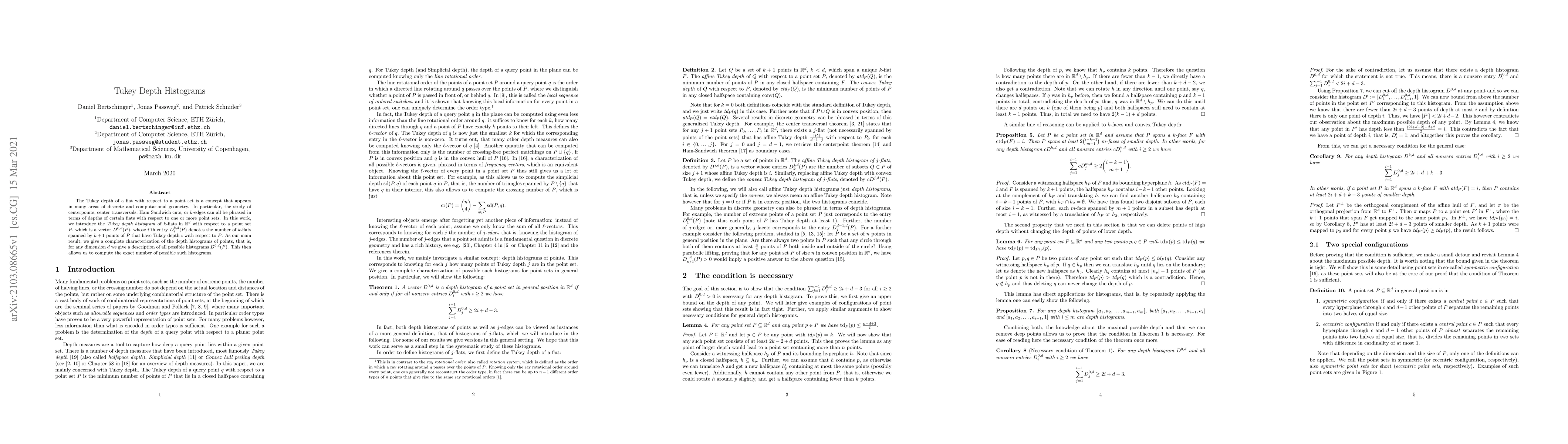 This paper introduces Tukey depth histograms for $k$-flats in $\mathbb{R}^d$ with respect to a point set $P$, describing the number of $k$-flats with Tukey depth $i$. The authors provide a complete characterization of depth histograms for points, determining all possible histograms $D^{0,d}(P)$ for any dimension $d$.