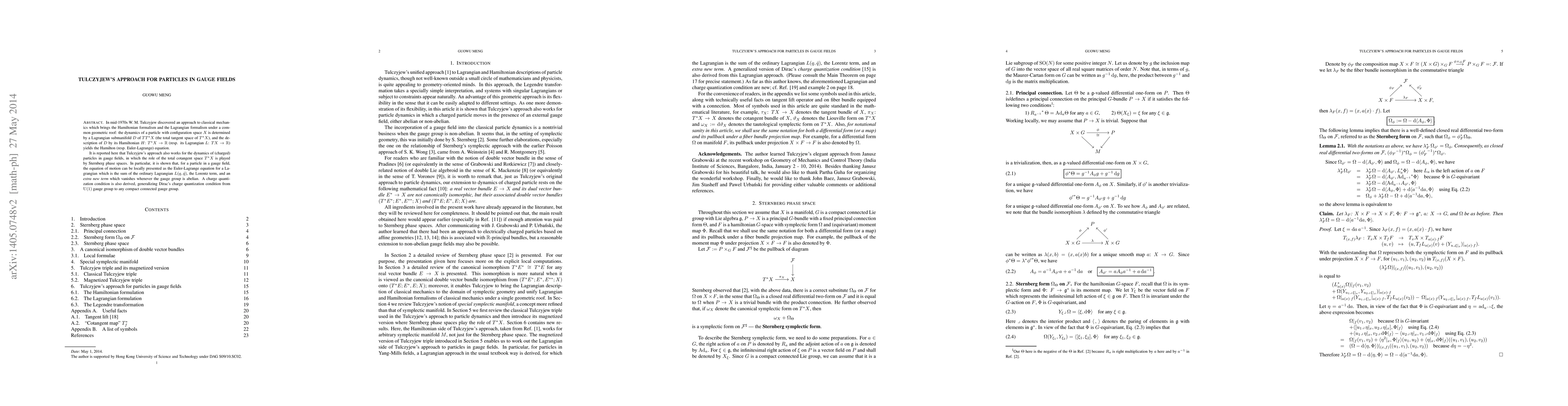 Around mid-1970s W. M. Tulczyjew discovered an approach which brings the two formalisms under a common geometric roof: the dynamics of a particle with configuration space $X$ is determined by a Lagrangian submanifold $D$ of $TT^*X$ (the total tangent space of $T^*X$), and the description of $D$ by its Hamiltonian $H$: $T^*X\to \mathbb R$ (resp. its Lagrangian $L$: $TX\to\mathbb R$) yields the Hamilton (resp. Euler-Lagrange) equation. It is reported here that Tulczyjew's approach also works for the dynamics of (charged) particles in gauge fields, in which the role of the total cotangent space $T^*X$ is played by Sternberg phase spaces. In particular, it is shown that, for a particle in a gauge field, the equation of motion can be locally presented as the Euler-Lagrange equation for a Lagrangian which is the sum of the ordinary Lagrangian $L(q, \dot q)$, the Lorentz term, and an extra new term which vanishes whenever the gauge group is abelian. A charge quantization condition is also derived, generalizing Dirac's charge quantization condition from $\mathrm{U}(1)$ gauge group to any compact connected gauge group.