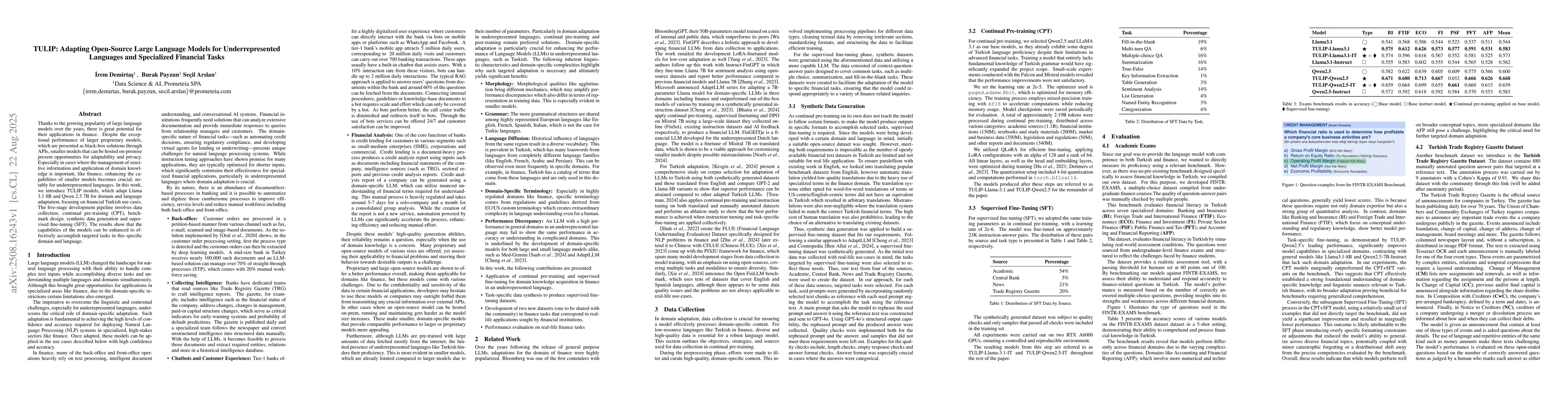 Thanks to the growing popularity of large language models over the years, there is great potential for their applications in finance. Despite the exceptional performance of larger proprietary models, which are presented as black-box solutions through APIs, smaller models that can be hosted on-premise present opportunities for adaptability and privacy. Especially in cases where the management of sensitive information and application of domain knowledge is important, like finance, enhancing the capabilities of smaller models becomes crucial, notably for underrepresented languages. In this work, we introduce TULIP models, which adapt Llama 3.1 8B and Qwen 2.5 7B for domain and language adaptation, focusing on financial Turkish use cases. The five-stage development pipeline involves data collection, continual pre-training (CPT), benchmark design, synthetic data generation and supervised fine-tuning (SFT). The results show that the capabilities of the models can be enhanced to effectively accomplish targeted tasks in this specific domain and language.