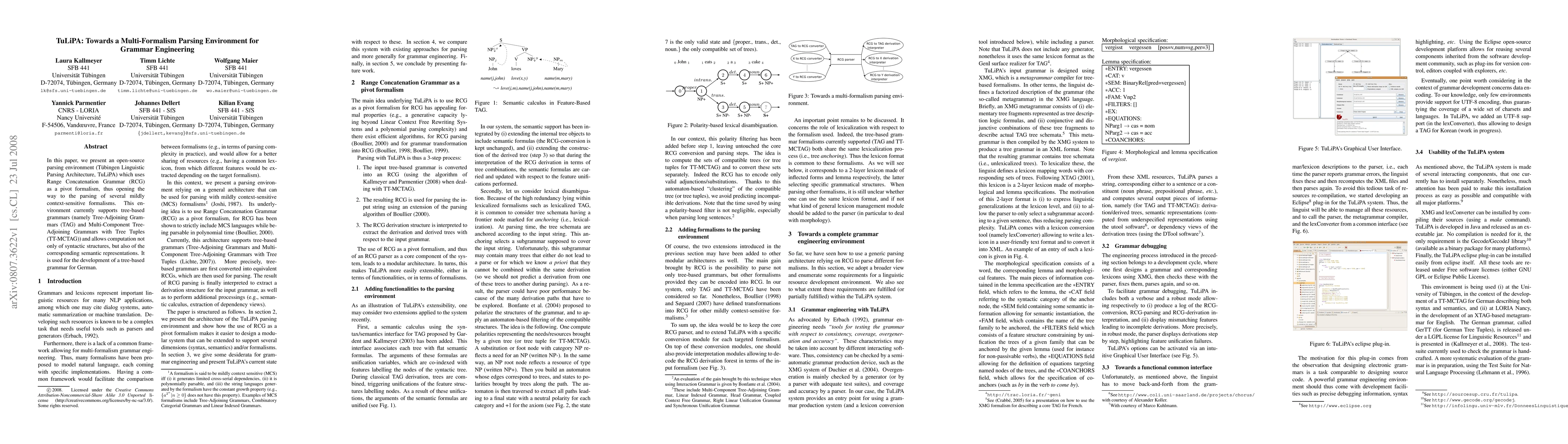 A new parsing environment called TuLiPA is introduced, allowing for the analysis of multiple grammatical formalisms, including Tree-Adjoining Grammars and Multi-Component Tree-Adjoining Grammars, with a focus on enabling grammar engineering in linguistics.