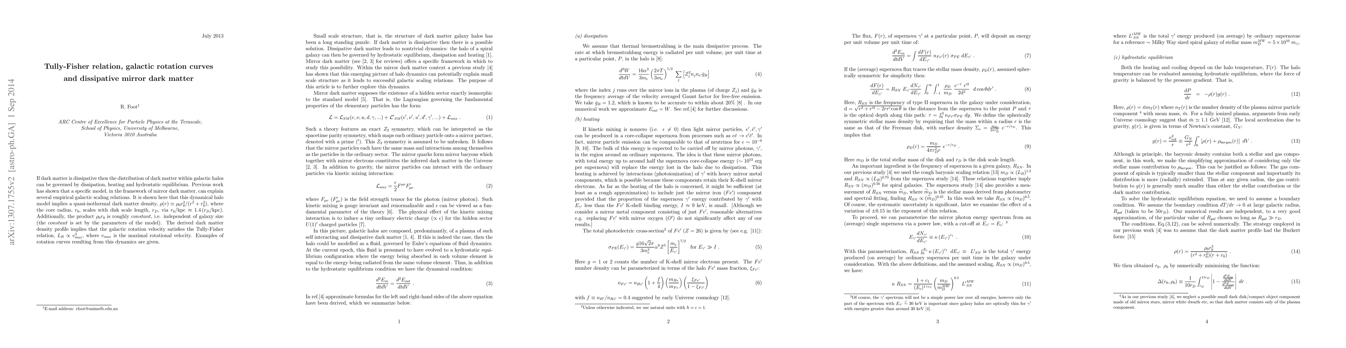 This paper explores a dissipative model of mirror dark matter that explains galactic scaling relations, showing that its quasi-isothermal density profile leads to a Tully-Fisher relation, where the maximal rotational velocity correlates with the galaxy's luminosity.