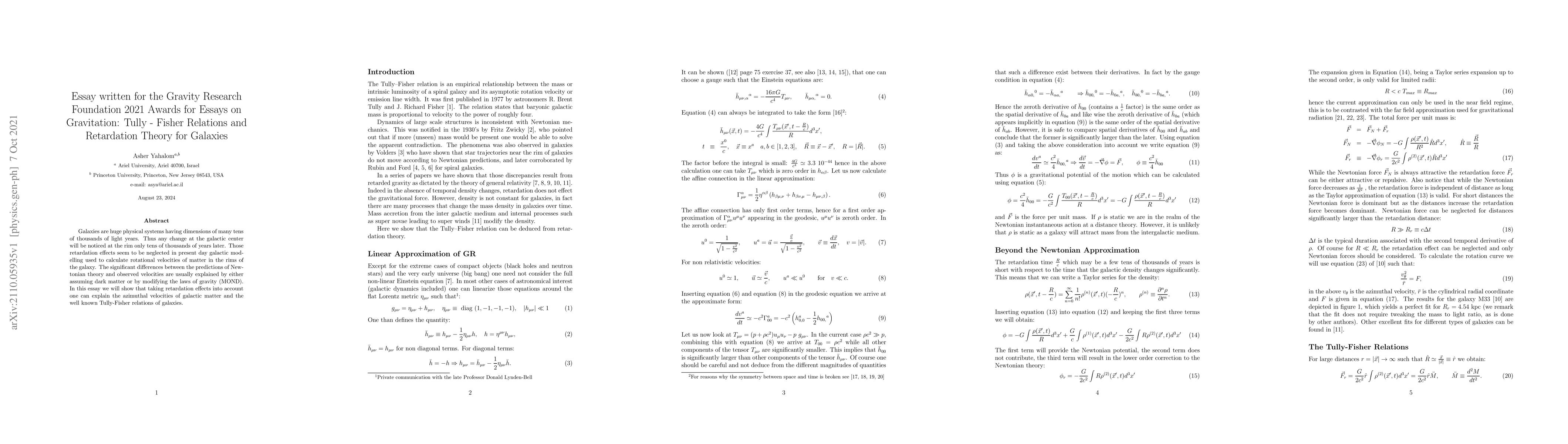 This research paper explores how accounting for retardation effects in galaxies can explain observed velocities and the Tully-Fisher relations, potentially replacing dark matter and modified gravity theories.