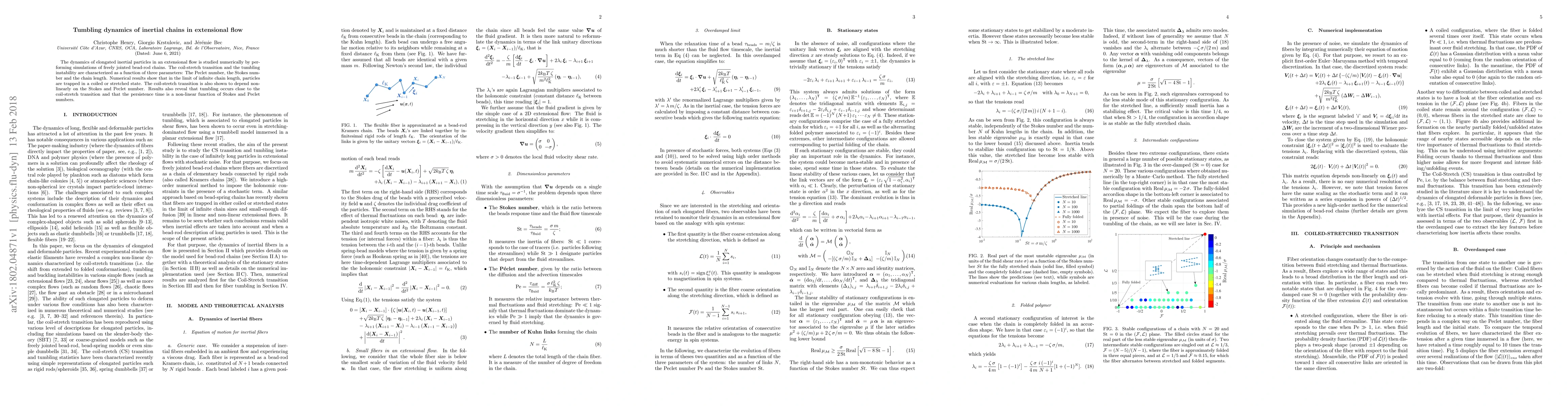 Researchers studied inertial chains in extensional flow, finding that chain length affects coil-stretch transition and tumbling instability, with persistence time being a non-linear function of Stokes number and Peclet number.