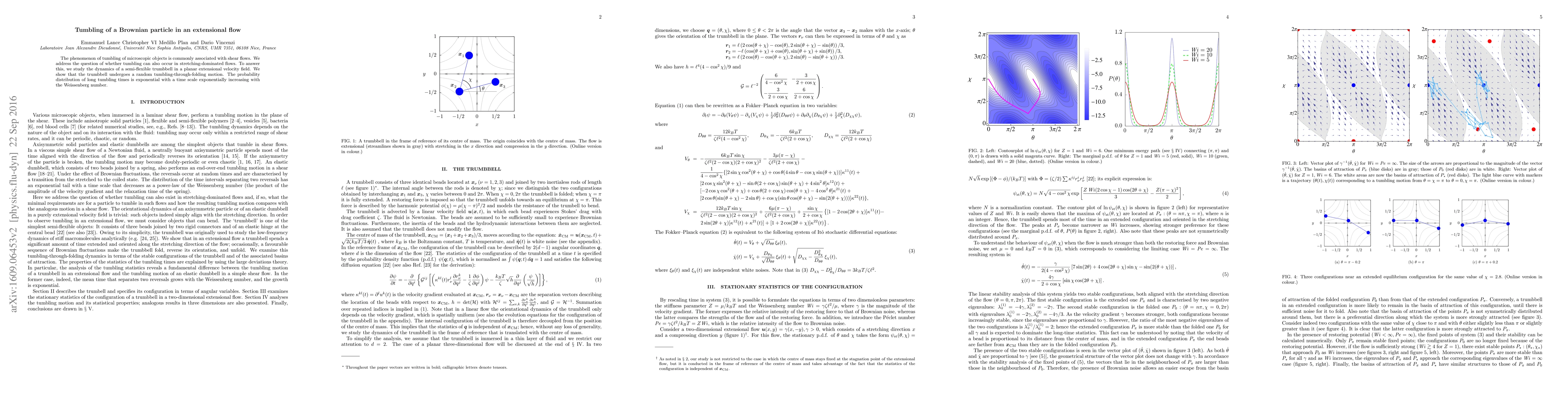The phenomenon of tumbling of microscopic objects is commonly associated with shear flows. We address the question of whether tumbling can also occur in stretching-dominated flows. To answer this, we study the dynamics of a semi-flexible trumbbell in a planar extensional velocity field. We show that the trumbbell undergoes a random tumbling-through-folding motion. The probability distribution of long tumbling times is exponential with a time scale exponentially increasing with the Weissenberg number.