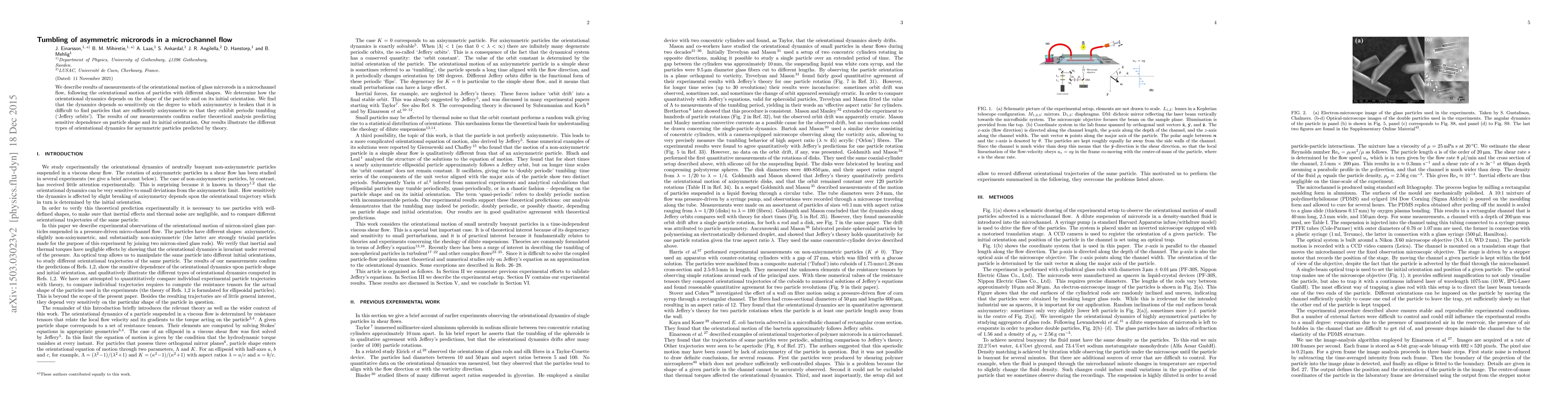 We describe results of measurements of the orientational motion of glass microrods in a microchannel flow, following the orientational motion of particles with different shapes. We determine how the orientational dynamics depends on the shape of the particle and on its initial orientation. We find that the dynamics depends so sensitively on the degree to which particle axisymmetry is broken that it is difficult to find particles that are sufficiently axisymmetric so that they exhibit periodic tumbling ("Jeffery orbits"). The results of our measurements confirm earlier theoretical analysis predicting sensitive dependence on particle shape and its initial orientation. Our results illustrate the different types of orientational dynamics for asymmetric particles predicted by theory.