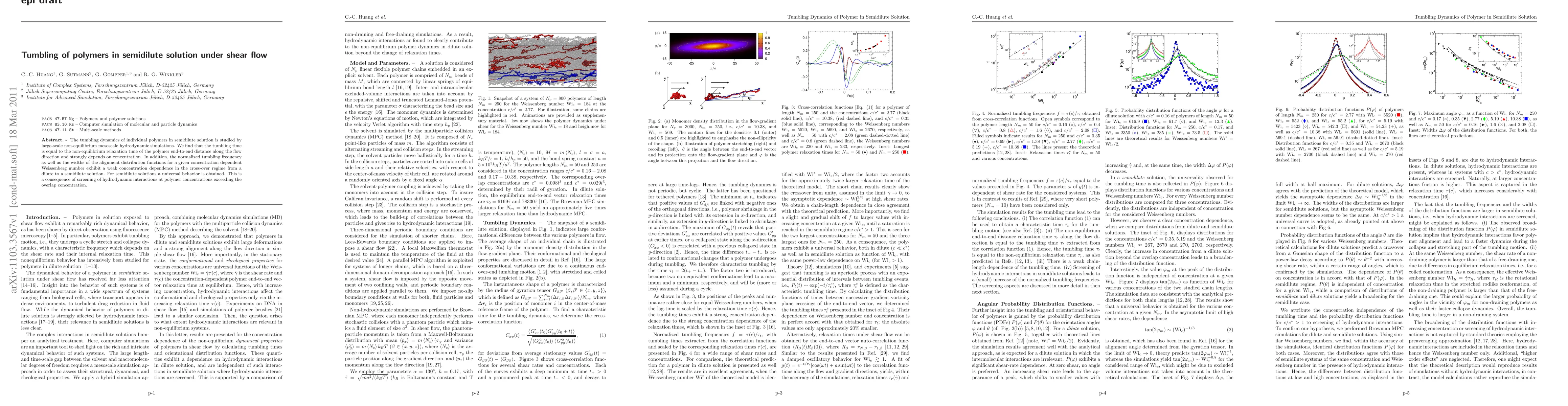 This study investigates the tumbling dynamics of polymers in semidilute solutions under shear flow using mesoscale simulations. The research reveals that tumbling time correlates with the polymer's relaxation time and is concentration-dependent, while the normalized tumbling frequency and alignment distribution widths show weak concentration dependence in the crossover regime, leading to universal behavior in semidilute solutions due to hydrodynamic interactions screening.