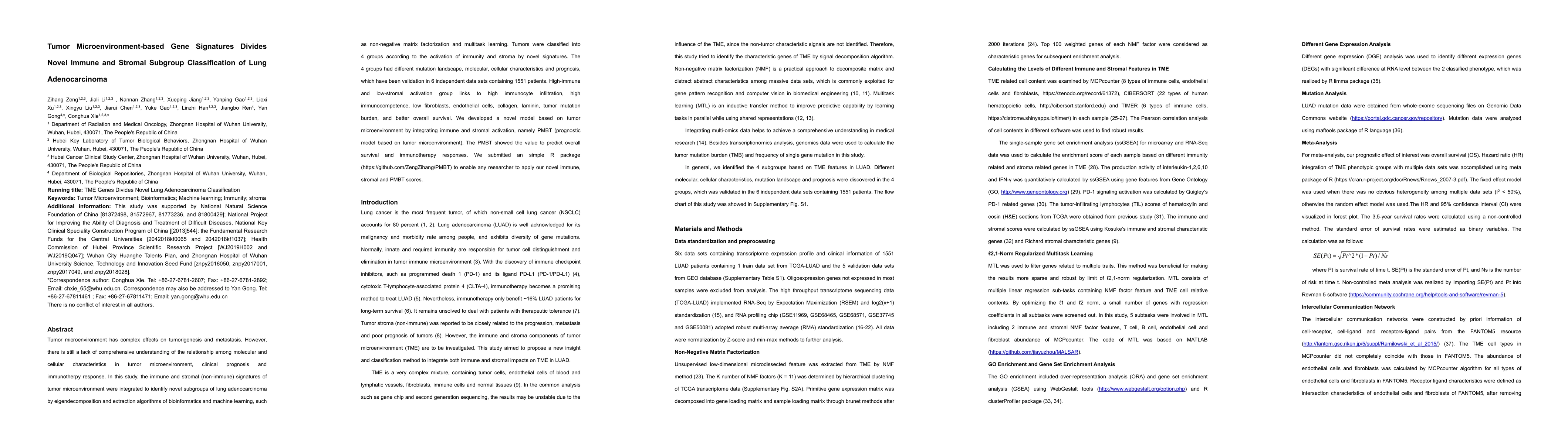 This study identifies novel subgroups of lung adenocarcinoma using integrated immune and stromal signatures from the tumor microenvironment, classifying tumors into four groups with distinct molecular and clinical characteristics. The PMBT model, based on these signatures, predicts overall survival and immunotherapy response.