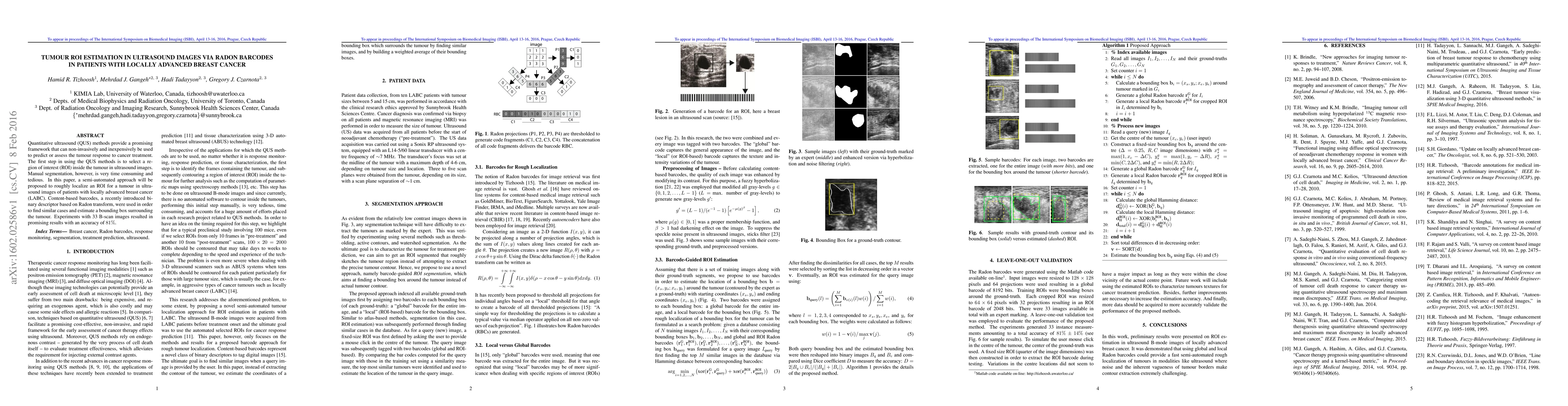 Quantitative ultrasound (QUS) methods provide a promising framework that can non-invasively and inexpensively be used to predict or assess the tumour response to cancer treatment. The first step in using the QUS methods is to select a region of interest (ROI) inside the tumour in ultrasound images. Manual segmentation, however, is very time consuming and tedious. In this paper, a semi-automated approach will be proposed to roughly localize an ROI for a tumour in ultrasound images of patients with locally advanced breast cancer (LABC). Content-based barcodes, a recently introduced binary descriptor based on Radon transform, were used in order to find similar cases and estimate a bounding box surrounding the tumour. Experiments with 33 B-scan images resulted in promising results with an accuracy of $81\%$.