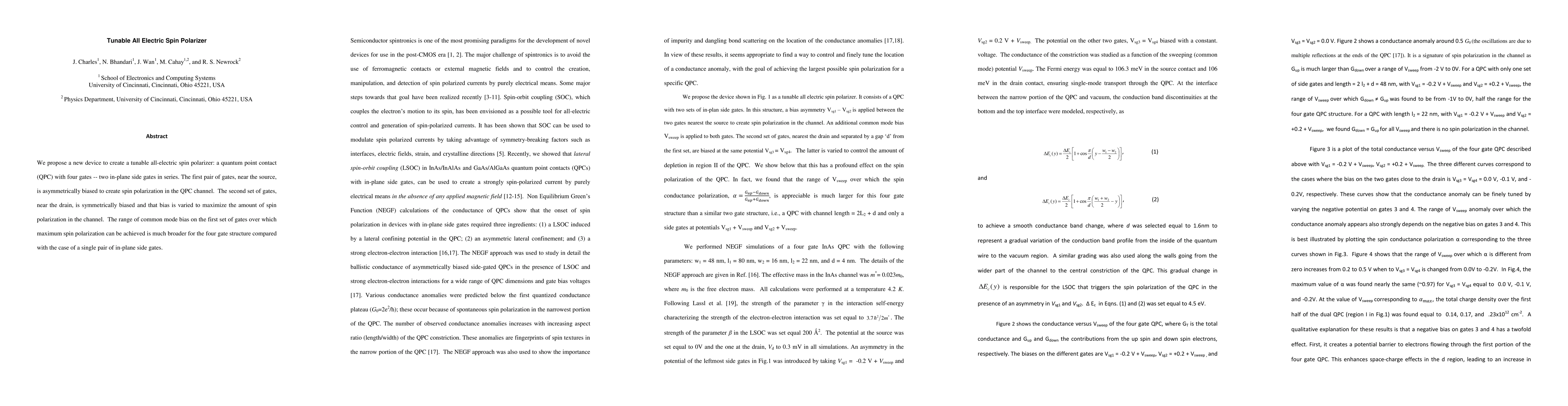 The paper proposes a tunable all-electric spin polarizer using a quantum point contact (QPC) with four gates, where asymmetric side gates near the source induce spin polarization, and adjustable symmetrical drain gates optimize the polarization. This four-gate design achieves broader operational conditions for maximum spin polarization compared to single-gate structures.