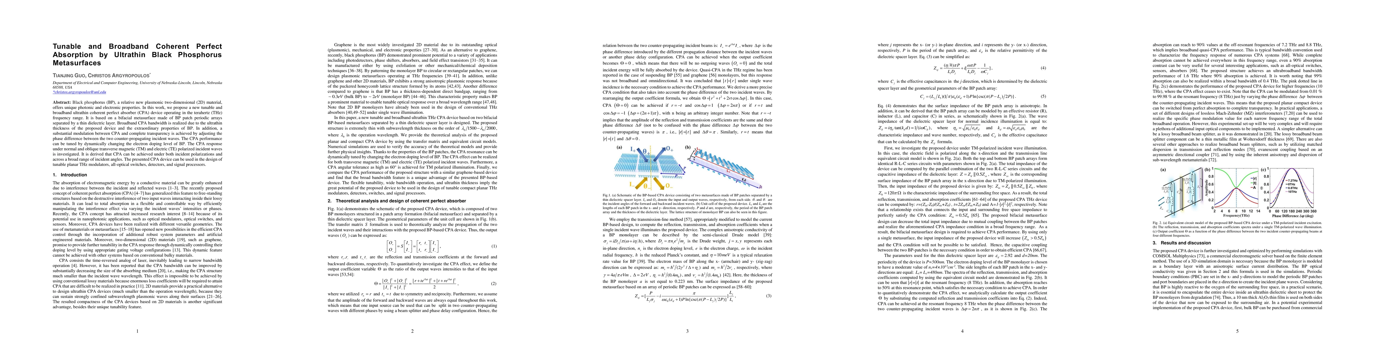 This paper proposes a tunable and broadband coherent perfect absorber (CPA) device based on ultrathin black phosphorus metasurfaces in the terahertz frequency range, achieving CPA through modulation of electron doping levels and varying incident wave polarizations and angles. The device's potential applications include tunable THz modulators, all-optical switches, detectors, and signal processors.