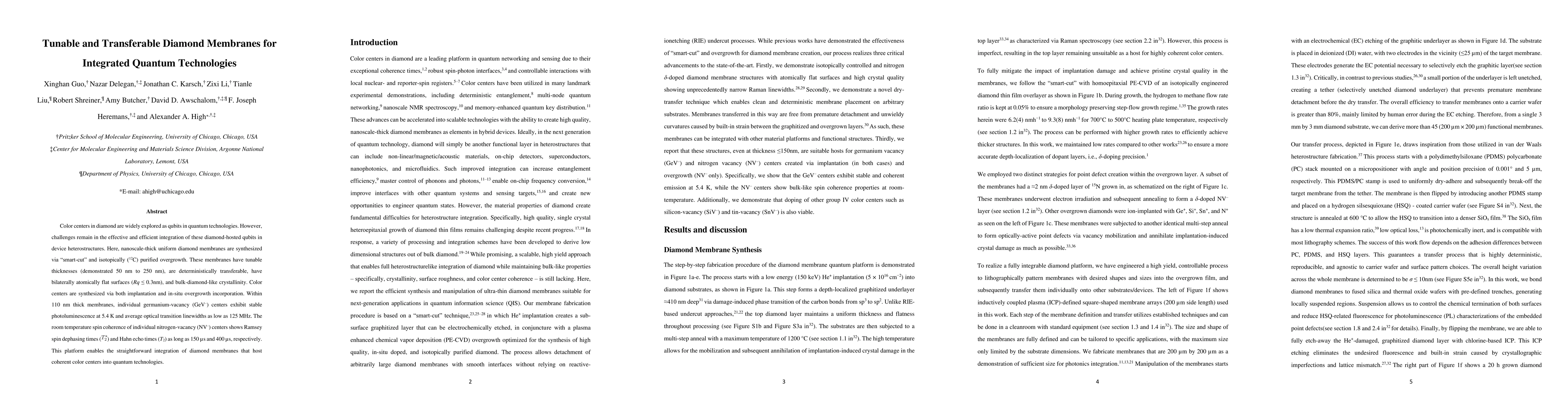 This paper reports the synthesis of tunable, transferable nanoscale diamond membranes via "smart-cut" and isotopic purification, facilitating the integration of diamond-hosted qubits in quantum technologies. These membranes exhibit atomically flat surfaces and support stable color center qubits with high coherence times, enabling effective incorporation into quantum devices.