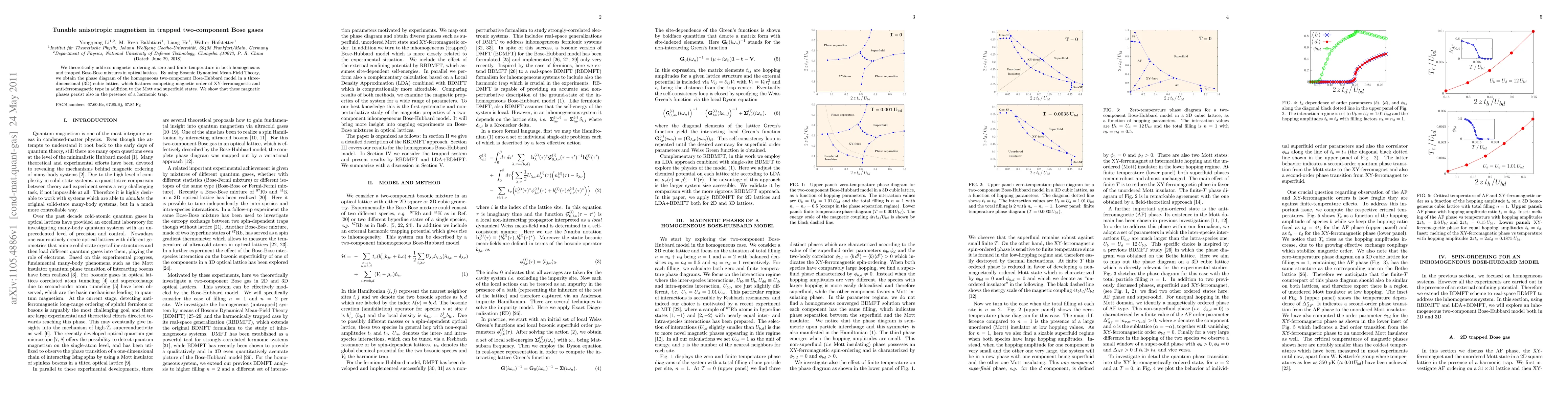 This paper theoretically explores magnetic ordering in trapped two-component Bose gases using Bosonic Dynamical Mean-Field Theory. It reveals a phase diagram featuring XY-ferromagnetic, anti-ferromagnetic, Mott, and superfluid states, with magnetic phases persisting under a harmonic trap.