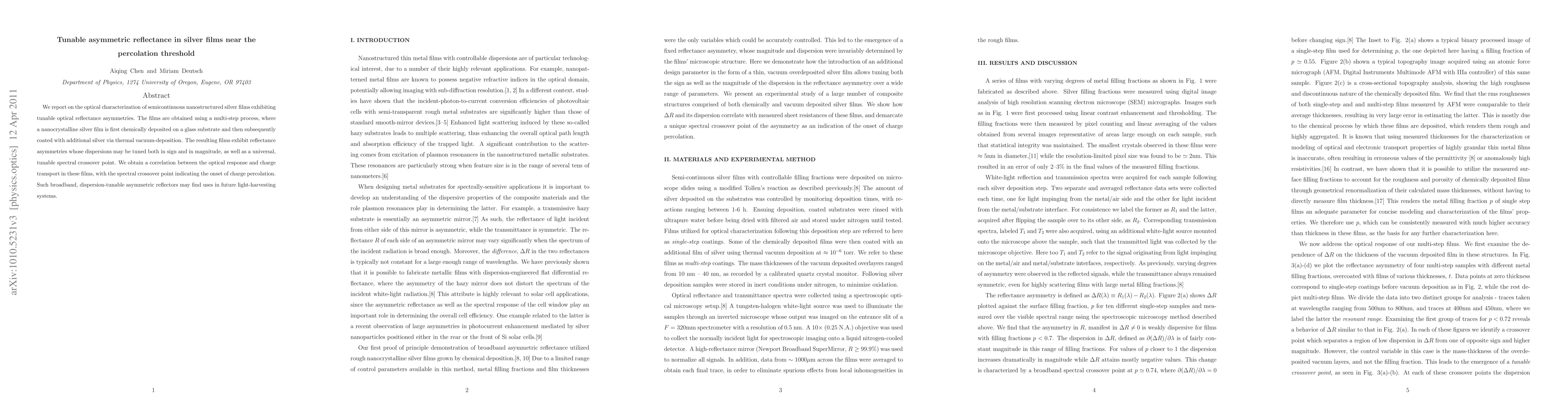 This paper investigates semicontinuous nanostructured silver films with tunable optical reflectance asymmetries, achieved through a multi-step process involving chemical deposition and thermal vacuum-deposition. The films show a universal tunable spectral crossover point correlating with the onset of charge percolation, suggesting potential applications in light-harvesting systems.
