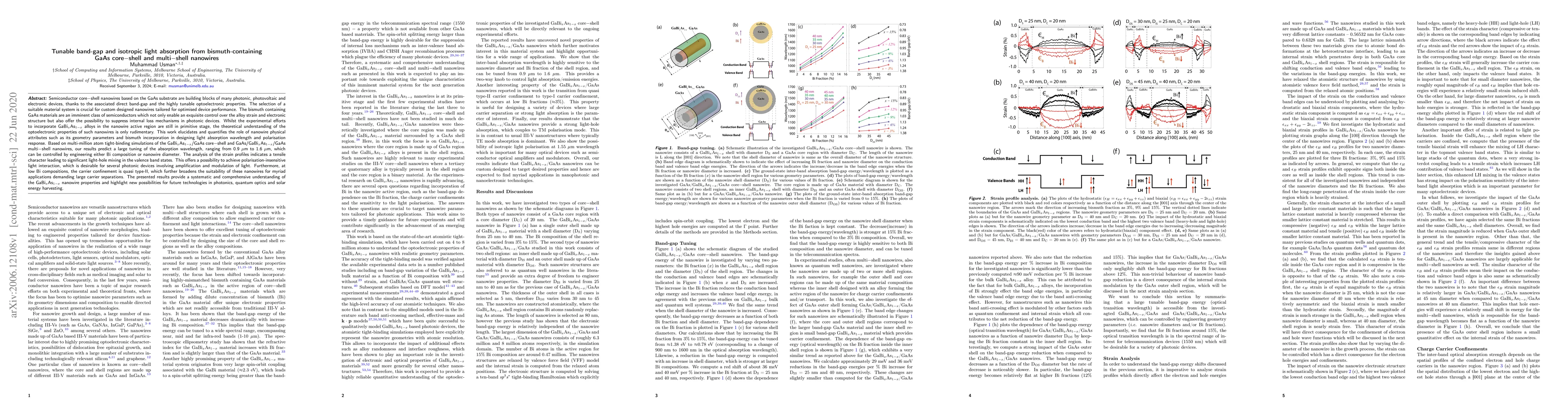 This paper investigates the tunable band-gap and isotropic light absorption in bismuth-containing GaAs core-shell and multi-shell nanowires, predicting significant absorption wavelength tuning from 0.9 to 1.6 µm via Bi composition or diameter engineering. The study highlights potential for polarization-insensitive light interaction, enhancing suitability for photonic devices.