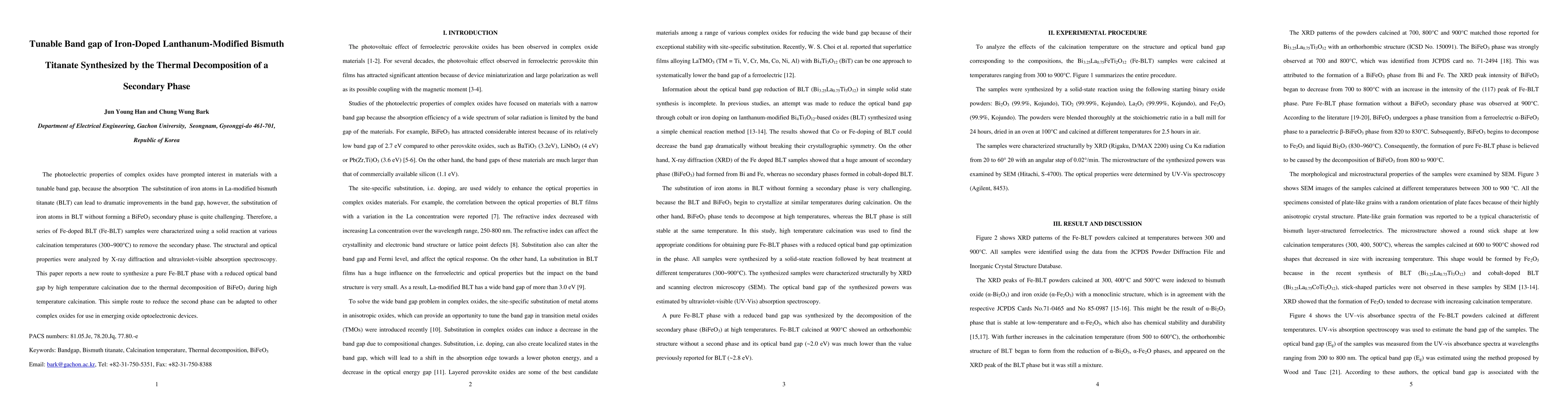 The photoelectric properties of complex oxides have prompted interest in materials with a tunable band gap, because the absorption The substitution of iron atoms in La-modified bismuth titanate (BLT) can lead to dramatic improvements in the band gap, however, the substitution of iron atoms in BLT without forming a BiFeO3 secondary phase is quite challenging. Therefore, a series of Fe-doped BLT (Fe-BLT) samples were characterized using a solid reaction at various calcination temperatures (300~900{\deg}C) to remove the secondary phase. The structural and optical properties were analyzed by X-ray diffraction and ultraviolet-visible absorption spectroscopy. This paper reports a new route to synthesize a pure Fe-BLT phase with a reduced optical band gap by high temperature calcination due to the thermal decomposition of BiFeO3 during high temperature calcination. This simple route to reduce the second phase can be adapted to other complex oxides for use in emerging oxide optoelectronic devices.