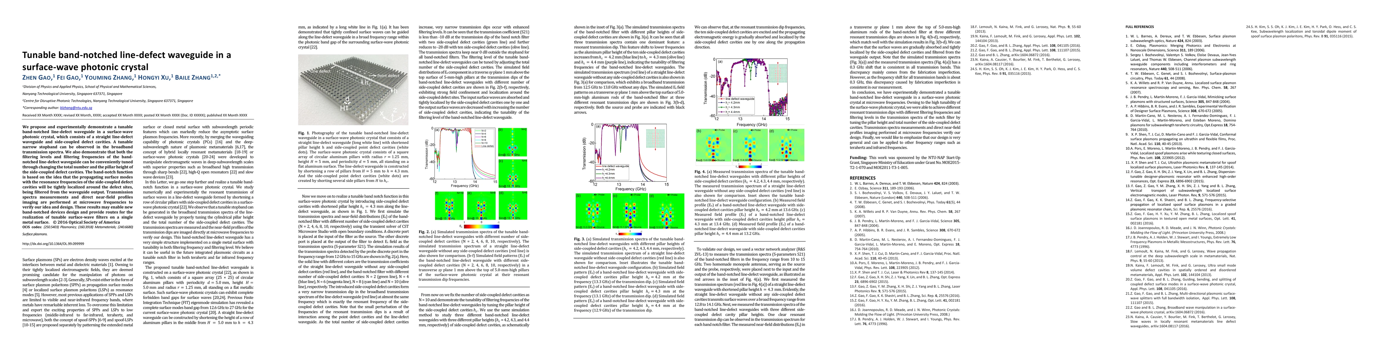 This paper proposes and demonstrates a tunable band-notched line-defect waveguide in a surface-wave photonic crystal, showing that filtering levels and frequencies can be adjusted by modifying the side-coupled defect cavities. Experimental results at microwave frequencies confirm the tunable stopband and potential for new surface-wave filter designs.