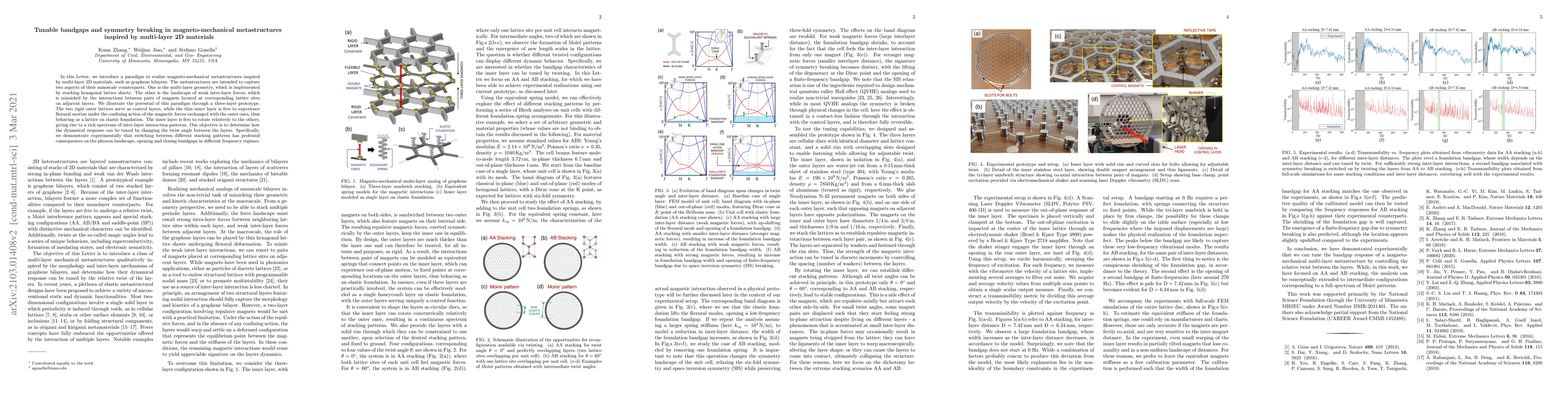 In this Letter, we introduce a paradigm to realize magneto-mechanical metastructures inspired by multi-layer 2D materials, such as graphene bilayers. The metastructures are intended to capture two aspects of their nanoscale counterparts. One is the multi-layer geometry, which is implemented by stacking hexagonal lattice sheets. The other is the landscape of weak inter-layer forces, which is mimicked by the interactions between pairs of magnets located at corresponding lattice sites on adjacent layers. We illustrate the potential of this paradigm through a three-layer prototype. The two rigid outer lattices serve as control layers, while the thin inner layer is free to experience flexural motion under the confining action of the magnetic forces exchanged with the outer ones, thus behaving as a lattice on elastic foundation. The inner layer is free to rotate relatively to the others, giving rise to a rich spectrum of inter-layer interaction patterns. Our objective is to determine how the dynamical response can be tuned by changing the twist angle between the layers. Specifically, we demonstrate experimentally that switching between different stacking patterns has profound consequences on the phonon landscape, opening and closing bandgaps in different frequency regimes.