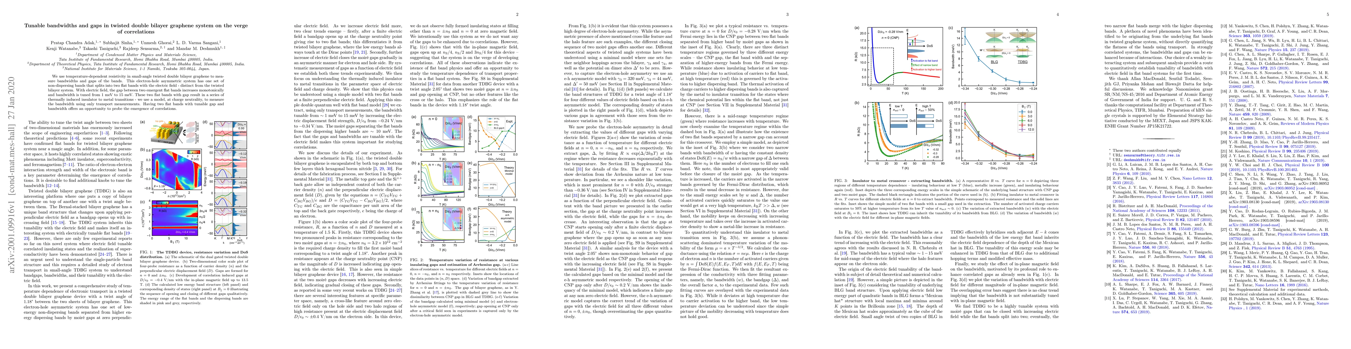 This study investigates the tunable bandwidths and gaps in a small-angle twisted double bilayer graphene system, revealing electron-hole asymmetric behavior and the emergence of flat bands. The system exhibits thermally induced insulator-to-metal transitions, with the gap between two flat bands increasing under an electric field, offering insights into the potential for probing emergent correlations.