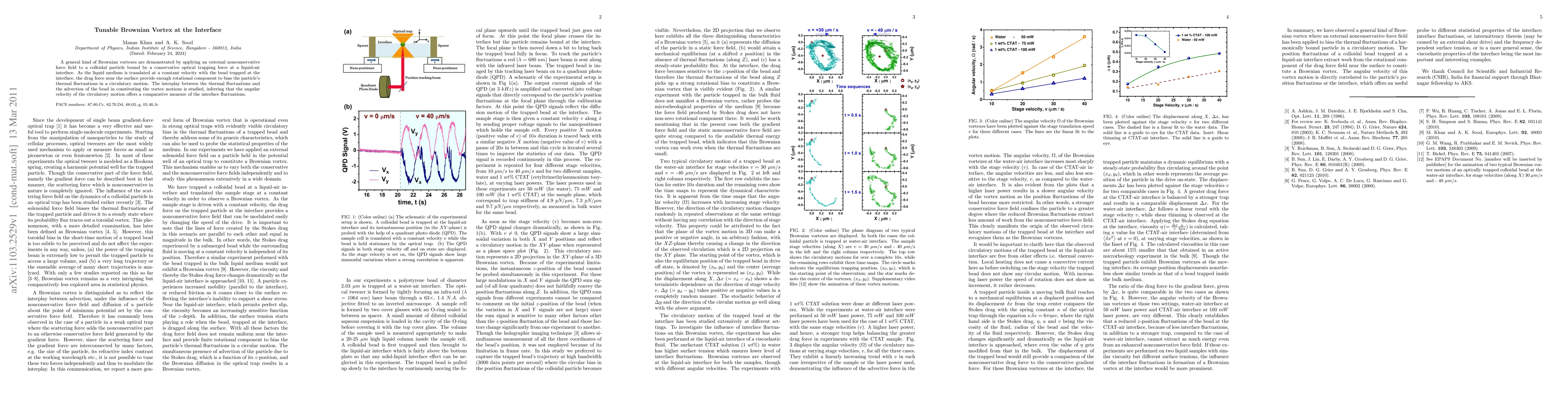 Researchers create a tunable Brownian vortex at an interface by applying a nonconservative force to a particle trapped in an optical trap. The angular velocity of the vortex motion can be used to measure the fluctuations in the liquid medium.