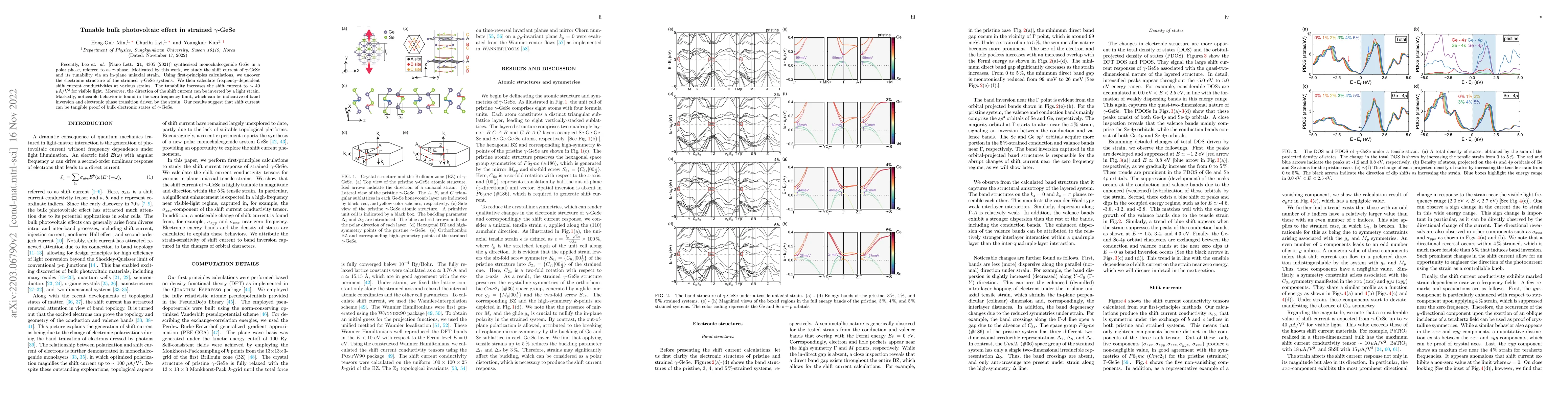 This study investigates the tunable bulk photovoltaic effect in strained $\gamma$-GeSe using first-principles calculations, revealing that in-plane uniaxial strain can enhance shift current up to $\sim$ 20 $\mu$A/V$^2$ and potentially indicate a topological phase transition. The direction of shift current can be inverted by light strain, suggesting its potential as a proof of $\gamma$-GeSe's bulk electronic states.