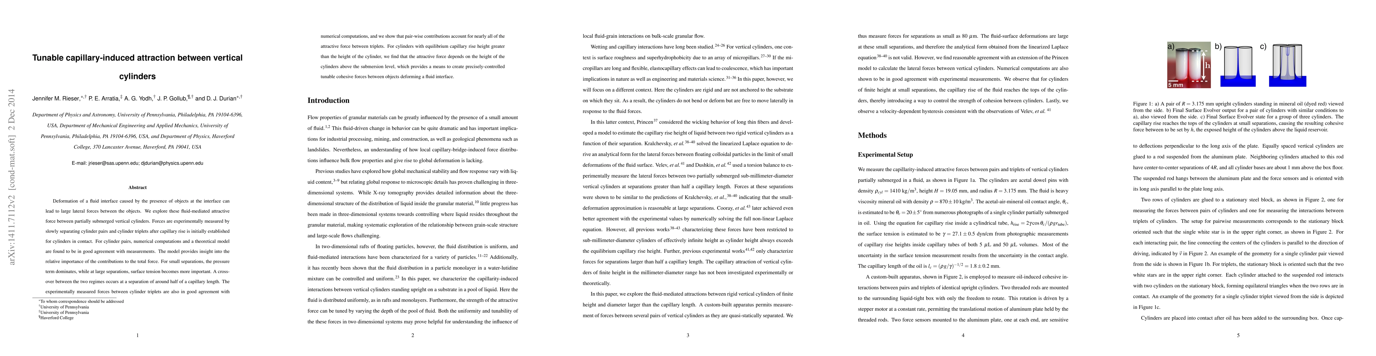 This paper investigates capillary-induced attraction between partially submerged vertical cylinders, demonstrating that the force depends on the separation distance and the height of the cylinders. Experimental and theoretical results show that pressure and surface tension contributions vary with separation, with a crossover regime around half the capillary length.