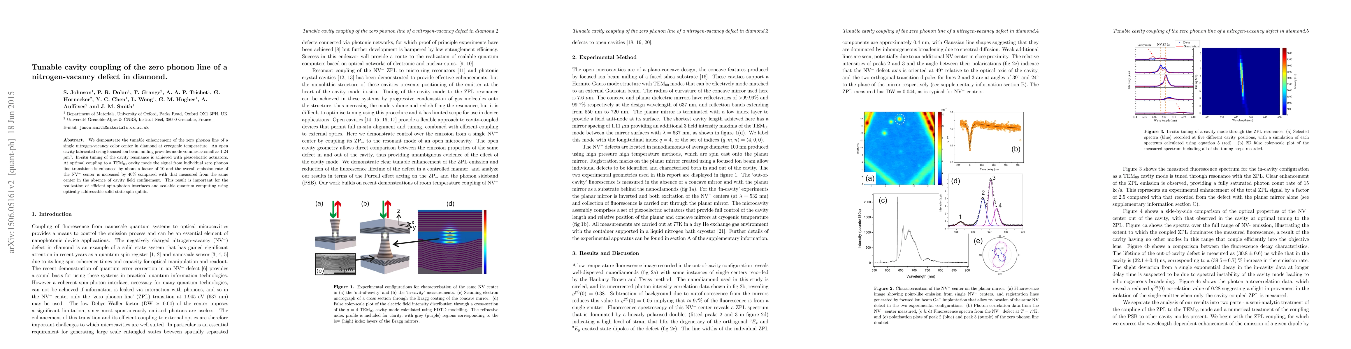 This research demonstrates the tunable enhancement of a nitrogen-vacancy defect's zero phonon line in diamond using a cryogenic open cavity, achieving a signal enhancement of about 10x and a 40% increase in emission rate. This tunable cavity coupling is significant for developing efficient spin-photon interfaces and scalable quantum computing.