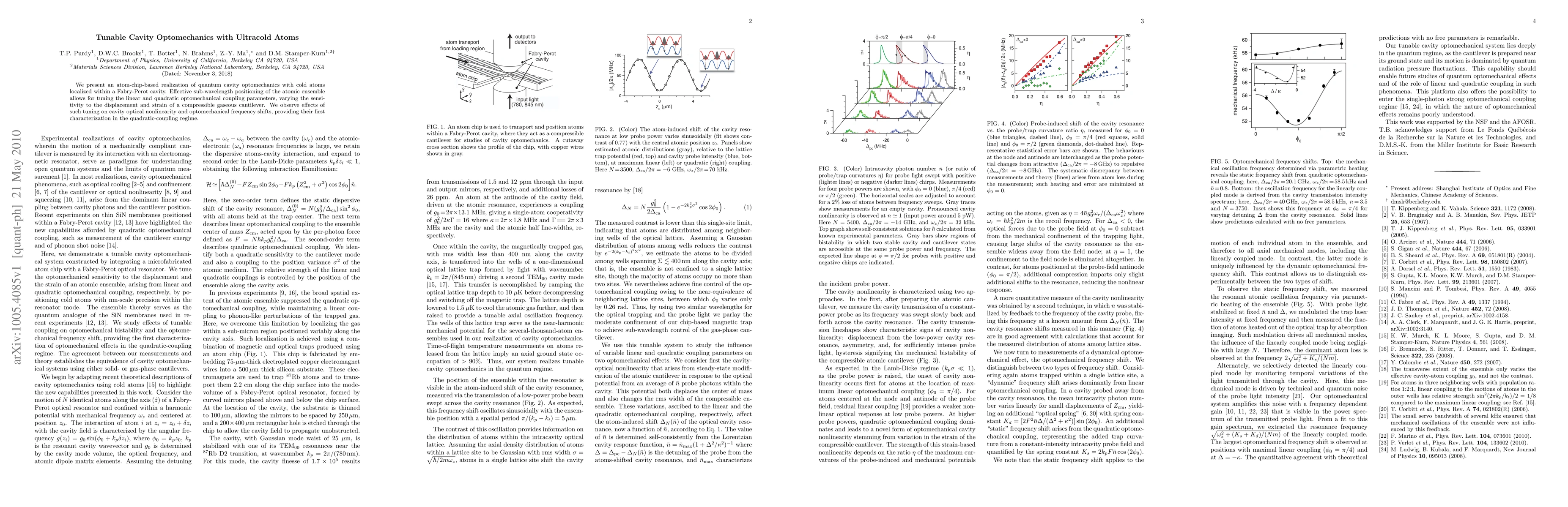 This paper details a quantum cavity optomechanics setup using ultracold atoms in a Fabry-Perot cavity, demonstrating tunable linear and quadratic optomechanical coupling. The study characterizes the effects of tuning on optical nonlinearity and optomechanical frequency shifts in the quadratic-coupling regime.
