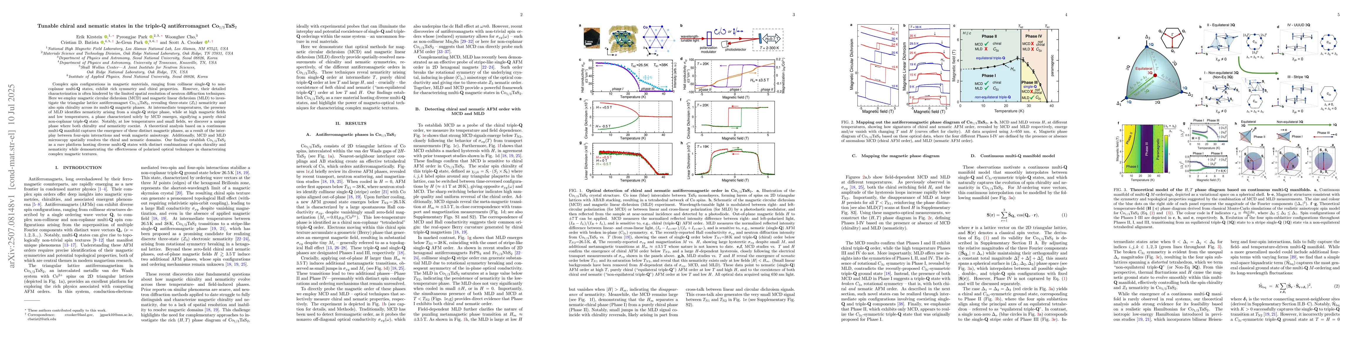 Complex spin configurations in magnetic materials, ranging from collinear single-Q to noncoplanar multi-Q states, exhibit rich symmetry and chiral properties. However, their detailed characterization is often hindered by the limited spatial resolution of neutron diffraction techniques. Here we employ magnetic circular dichroism (MCD) and magnetic linear dichroism (MLD) to investigate the triangular lattice antiferromagnet Co$_{1/3}$TaS$_2$, revealing three-state (Z3) nematicity and also spin chirality across its multi-Q magnetic phases. At intermediate temperatures, the presence of MLD identifies nematicity arising from a single-Q stripe phase, while at high magnetic fields and low temperatures, a phase characterized solely by MCD emerges, signifying a purely chiral non-coplanar triple-Q state. Notably, at low temperatures and small fields, we discover a unique phase where both chirality and nematicity coexist. A theoretical analysis based on a continuous multi-Q manifold captures the emergence of these distinct magnetic phases, as a result of the interplay between four-spin interactions and weak magnetic anisotropy. Additionally, MCD and MLD microscopy spatially resolves the chiral and nematic domains. Our findings establish Co$_{1/3}$TaS$_2$ as a rare platform hosting diverse multi-Q states with distinct combinations of spin chirality and nematicity while demonstrating the effectiveness of polarized optical techniques in characterizing complex magnetic textures.