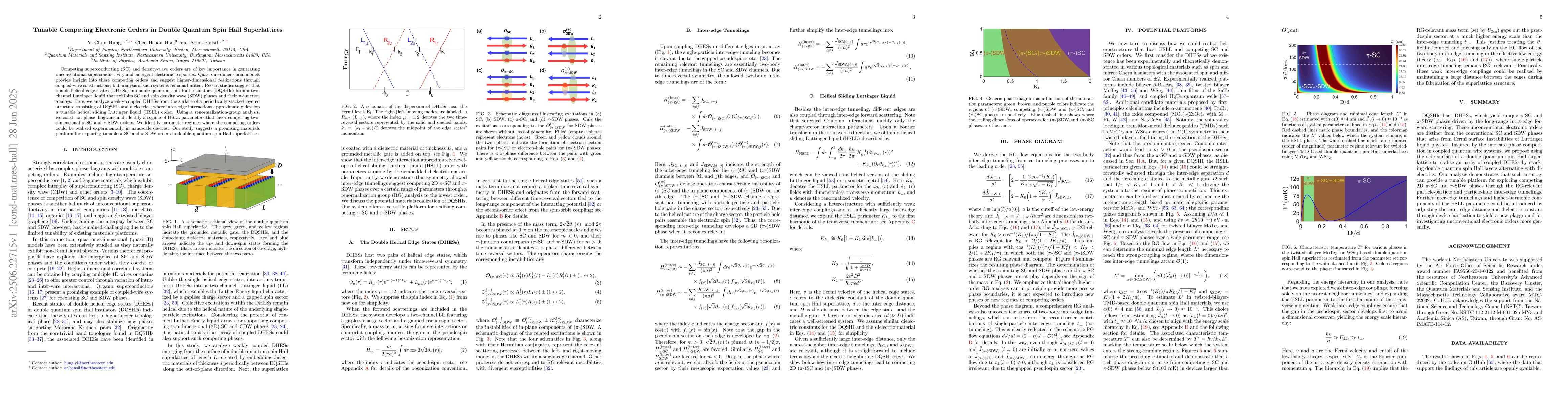 Competing superconducting (SC) and density-wave orders are of key importance in generating unconventional superconductivity and emergent electronic responses. Quasi-one-dimensional models provide insight into these competing orders and suggest higher-dimensional realizations through coupled-wire constructions, but analysis of such systems remains limited. Recent studies suggest that double helical edge states (DHESs) in double quantum spin Hall insulators (DQSHIs) form a two-channel Luttinger liquid that exhibits SC and spin density wave (SDW) phases and their $\pi$-junction analogs. Here, we analyze weakly coupled DHESs from the surface of a periodically stacked layered structure consisting of DQSHIs and dielectrics, where inter-edge interactions approximately develop a tunable helical sliding Luttinger liquid (HSLL) order. Using a renormalization-group analysis, we construct phase diagrams and identify a regime of HSLL parameters that favor competing two-dimensional $\pi$-SC and $\pi$-SDW orders. We identify parameter regimes where the competing orders could be realized experimentally in nanoscale devices. Our study suggests a promising materials platform for exploring tunable $\pi$-SC and $\pi$-SDW orders in double quantum spin Hall superlattices.