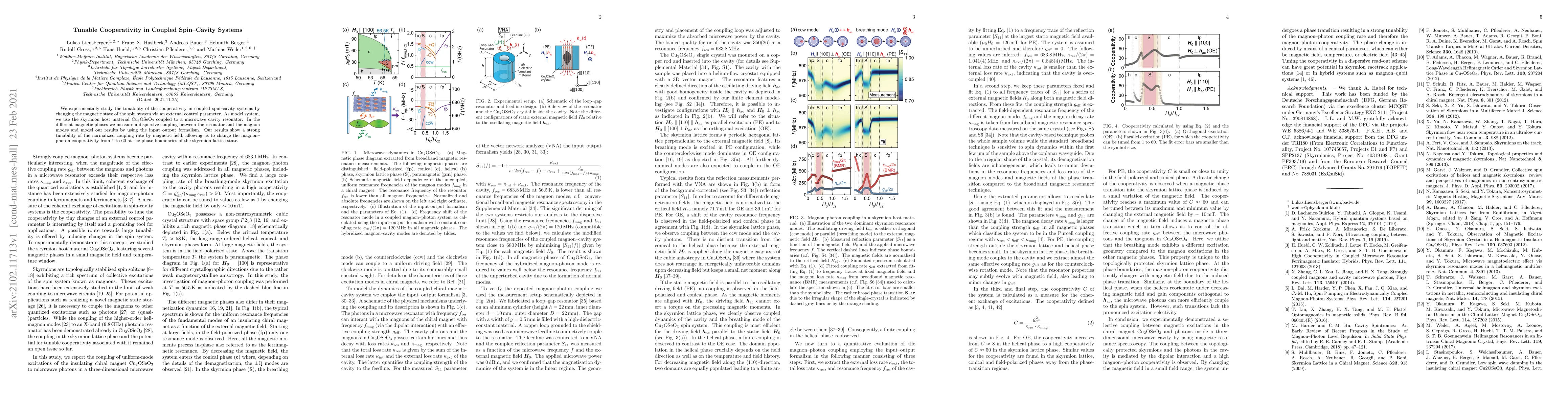 This paper investigates the tunability of cooperativity in spin-cavity systems using Cu$_2$OSeO$_3$ coupled to a microwave cavity. By altering the magnetic state via an external magnetic field, the study demonstrates significant variation in magnon-photon coupling, ranging from 1 to 60 at the boundaries of the skyrmion lattice phase.