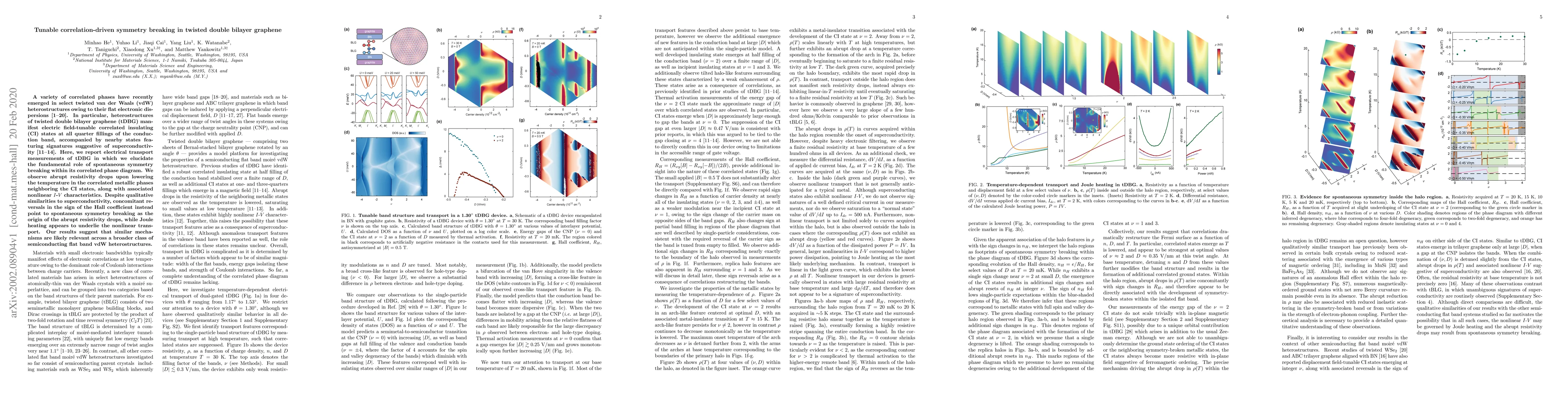 This study investigates twisted double bilayer graphene (tDBG) and reveals its electric field-tunable correlated insulating states. Through transport measurements, the research identifies spontaneous symmetry breaking as the cause of resistivity drops in correlated metallic phases, suggesting broad relevance for similar semiconducting heterostructures.