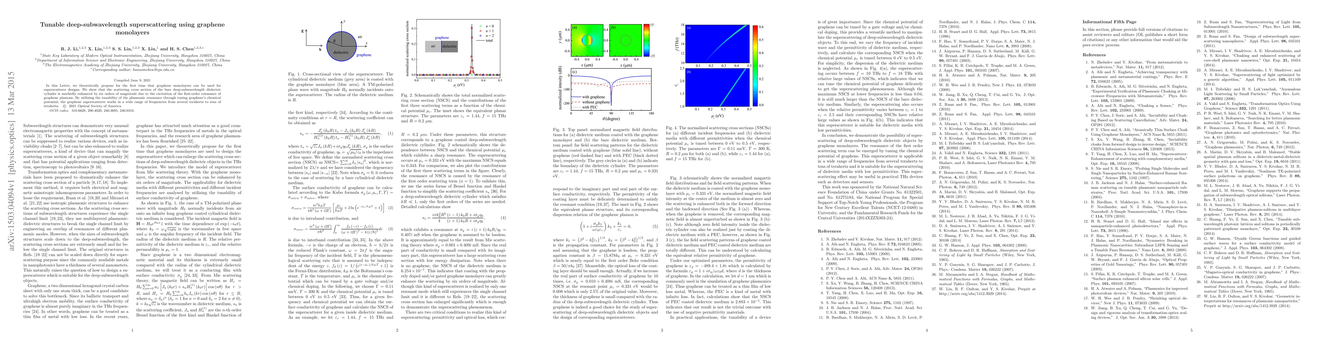 This paper proposes a novel superscattering design using graphene monolayers, demonstrating a six-order-of-magnitude enhancement in scattering cross section through excitation of graphene plasmons. The tunable plasmonic resonance allows the superscatterer to operate across a broad frequency range from terahertz to tens of terahertz.