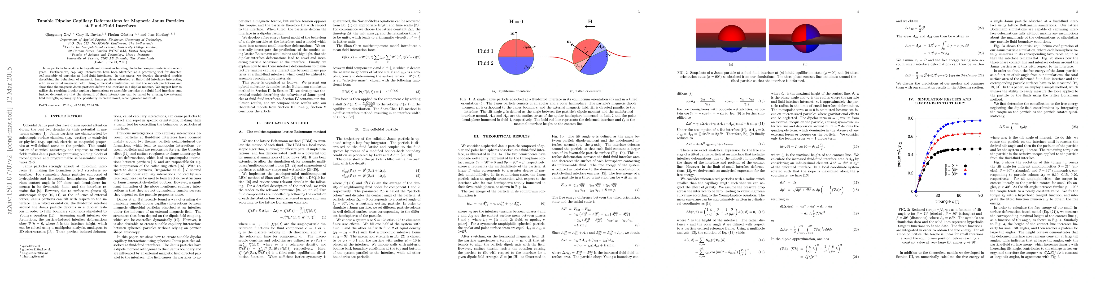 This paper develops theoretical models and simulations to describe the behavior of magnetic Janus particles at fluid-fluid interfaces, showing that they induce dipolar capillary deformations. The study demonstrates that the strength of these interactions can be tuned by adjusting the external magnetic field, enabling the assembly of reconfigurable materials.