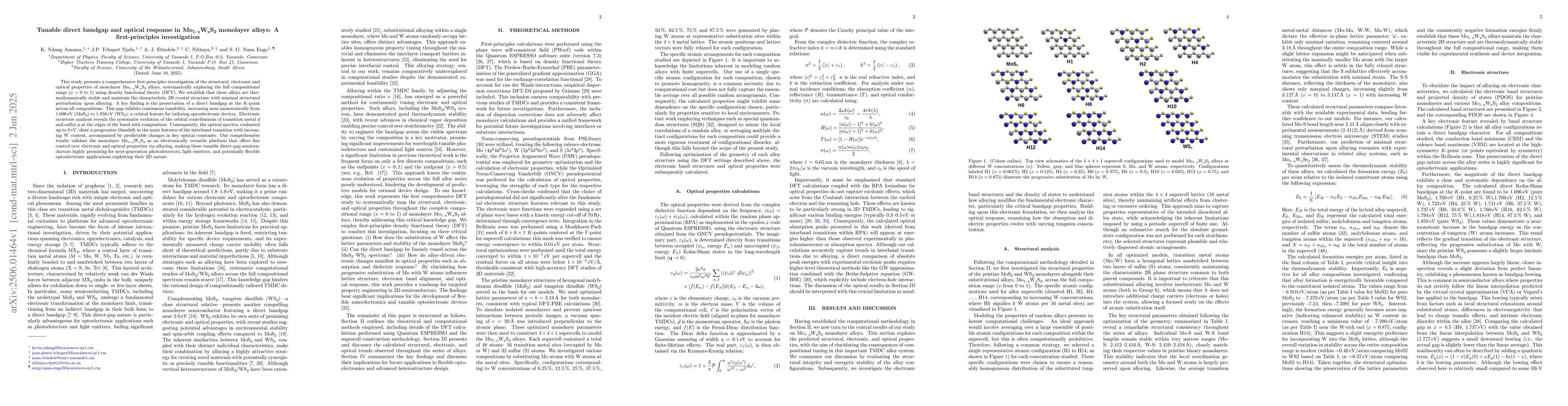 The comprehensive first-principles investigation of structural, electronic, and optical properties of Mo_{1-x}W_xS2 monolayer alloys, demonstrating their stability, tunable bandgap, and optical response.