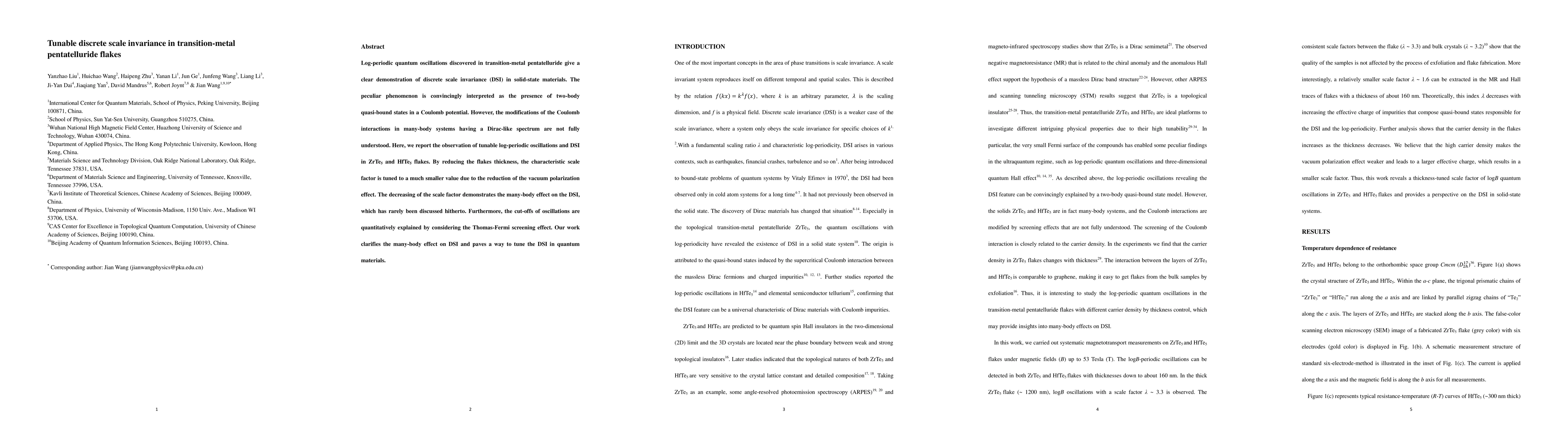 This paper reports tunable log-periodic oscillations and discrete scale invariance (DSI) in ZrTe5 and HfTe5 flakes, demonstrating the many-body effect on DSI. By thinning the flakes, the characteristic scale factor is reduced, showcasing the influence of vacuum polarization and Thomas-Fermi screening effects.